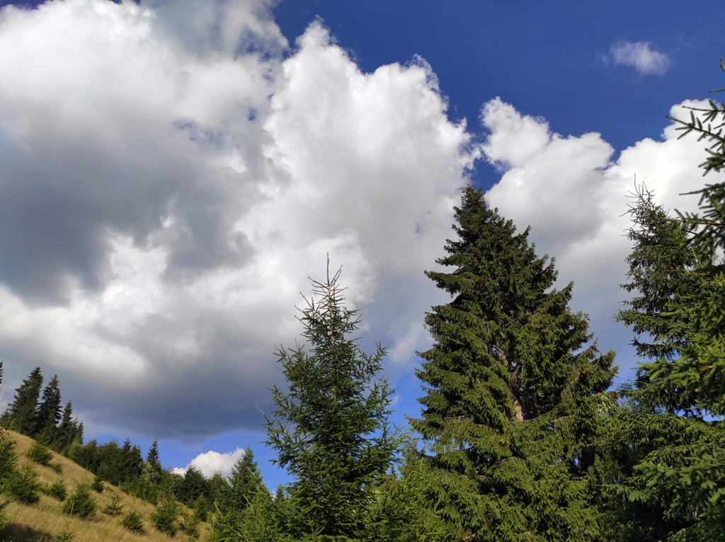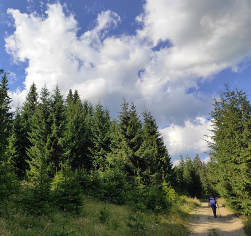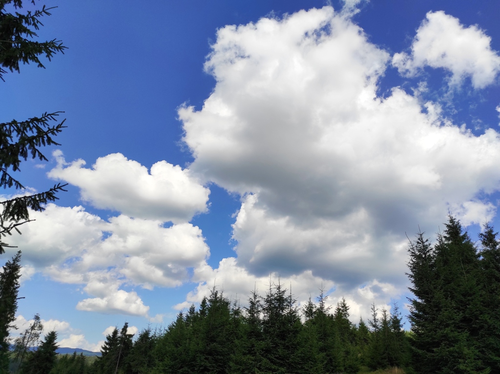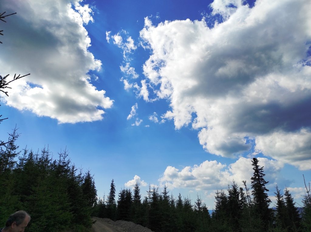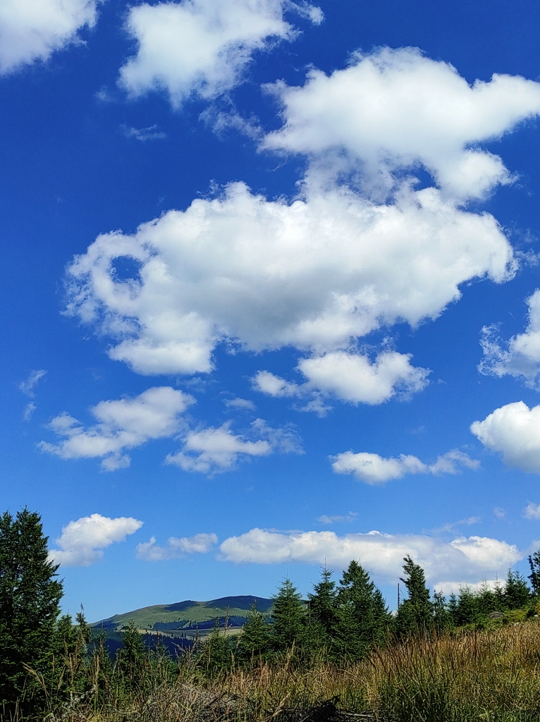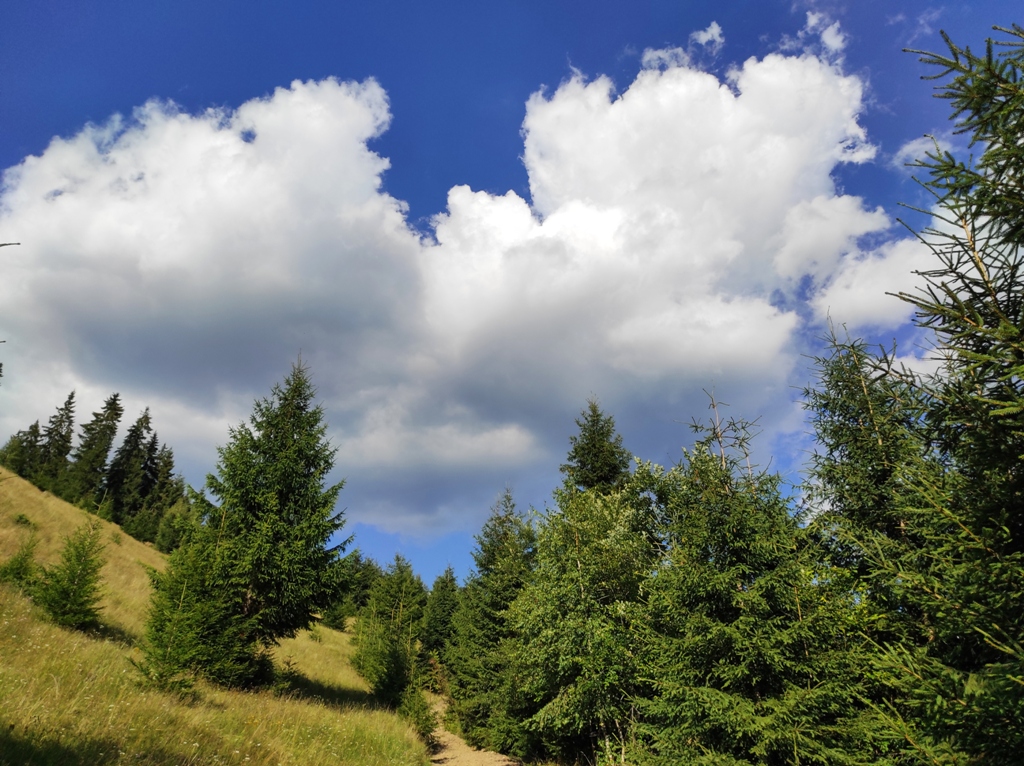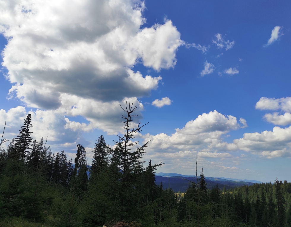 Pornim și continuăm traseul prin Obcina Mestecăniș apoi intrăm în Tara Dornelor şi suntem din nou fascinaţi de mirificele peisaje ce ne sunt oferite privirii dar şi de formațiunile foarte ciudate de nori ce ne tot apar pe cer. Printre aceste așa zise entități identificăm și doi parașutiști sau parapantiști, apăruți parcă de nicăieri. Robert spune că au fost catapultați dintr-un avion pe care l-a văzut doar el. Mie mi se pare că au apărut din senin. Să fie oare extratereştri sau totuși fiinţe umane? Mai spune că era să calce și pe un șarpe sau viperă, și insistă aşa mult pe acest fapt încât şi mie mi se pare că văd un pui de urs care apare dar şi dispare rapid în tufișul de alături! O fi fost, n-o fi fost.. Cert este însă un lucru, am mâncat așa de multe afine, încât ne-am săturat.