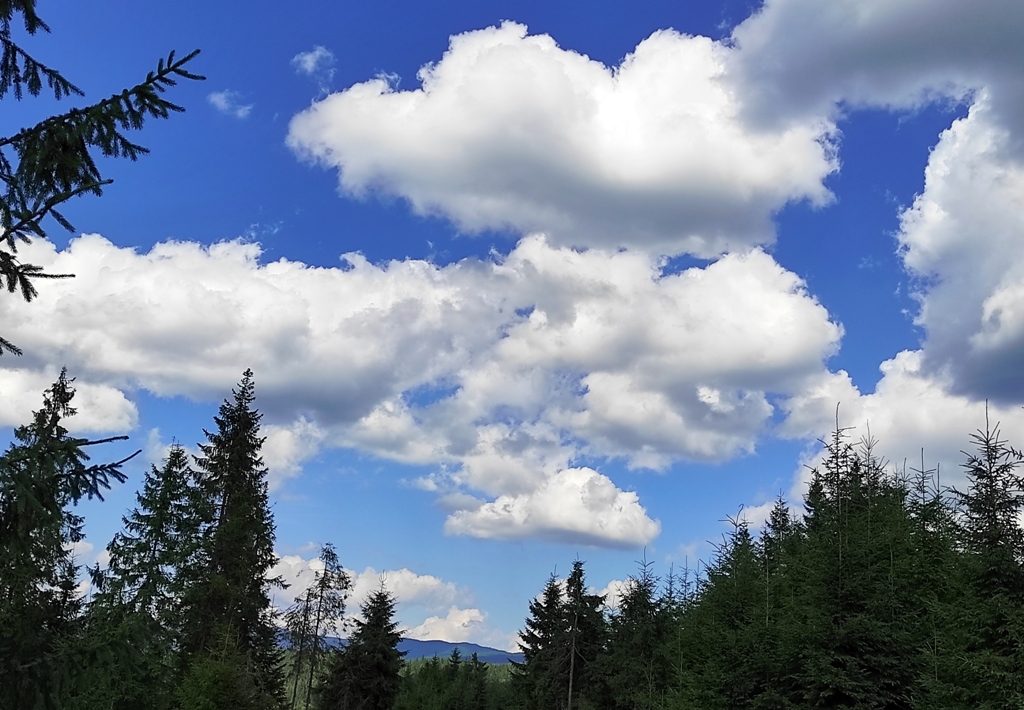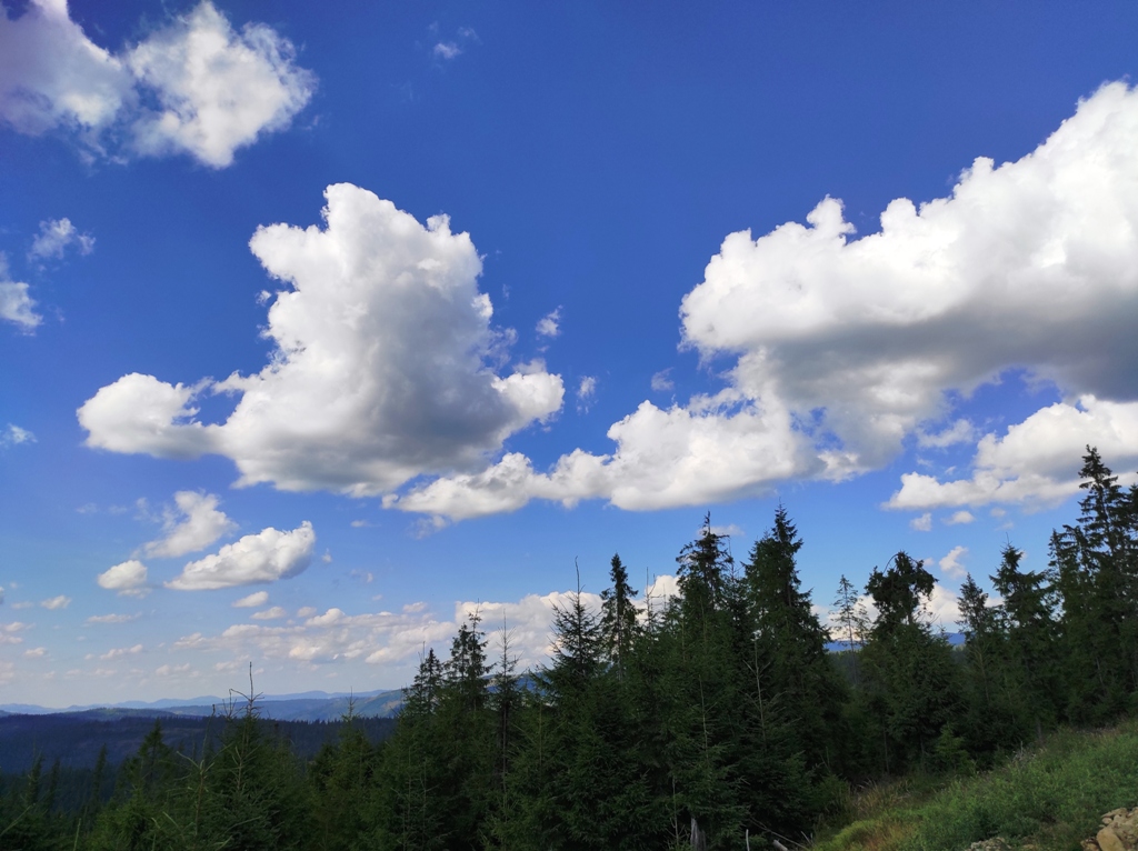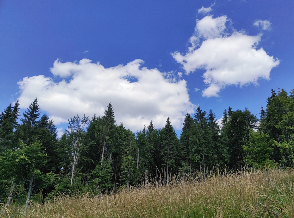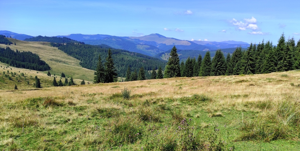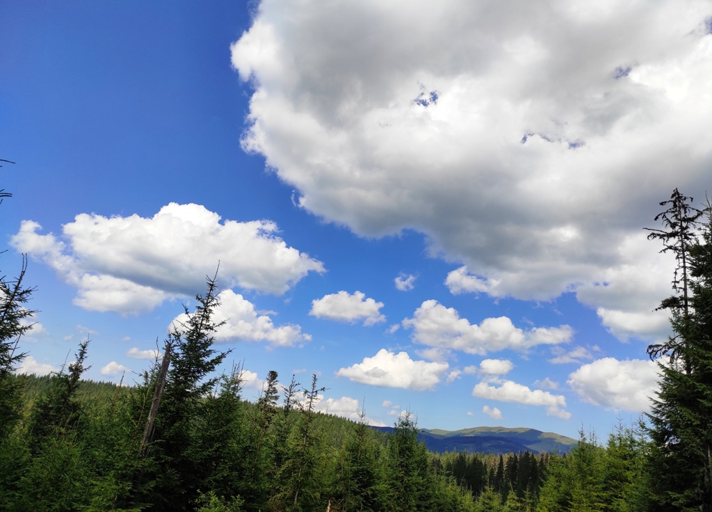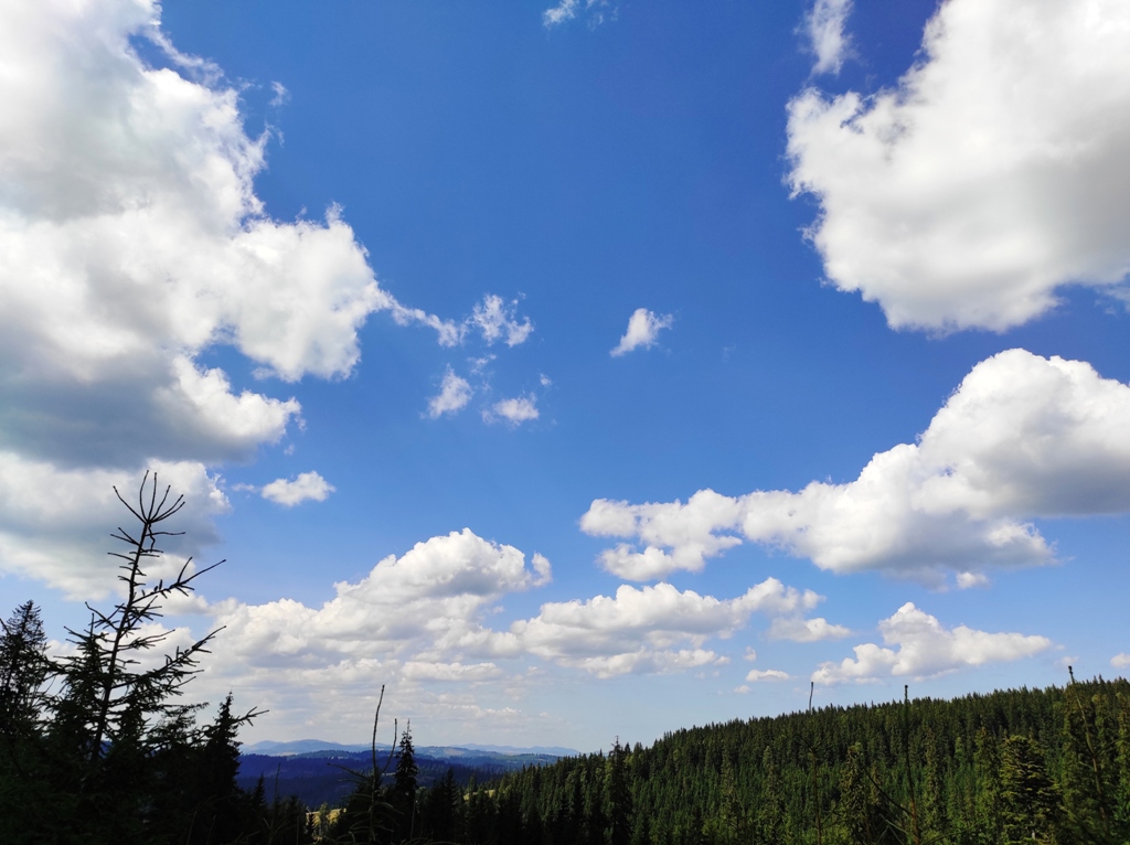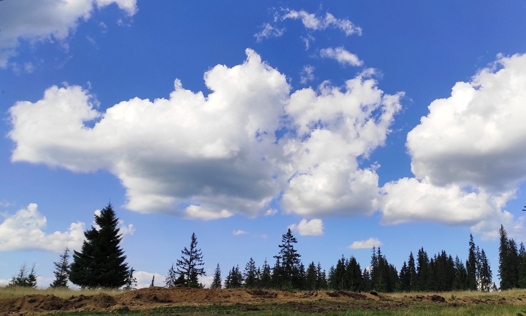 Pornim și continuăm traseul prin Obcina Mestecăniș apoi intrăm în Tara Dornelor şi suntem din nou fascinaţi de mirificele peisaje ce ne sunt oferite privirii dar şi de formațiunile foarte ciudate de nori ce ne tot apar pe cer. Printre aceste așa zise entități identificăm și doi parașutiști sau parapantiști, apăruți parcă de nicăieri. Robert spune că au fost catapultați dintr-un avion pe care l-a văzut doar el. Mie mi se pare că au apărut din senin. Să fie oare extratereştri sau totuși fiinţe umane? Mai spune că era să calce și pe un șarpe sau viperă, și insistă aşa mult pe acest fapt încât şi mie mi se pare că văd un pui de urs care apare dar şi dispare rapid în tufișul de alături! O fi fost, n-o fi fost.. Cert este însă un lucru, am mâncat așa de multe afine, încât ne-am săturat.