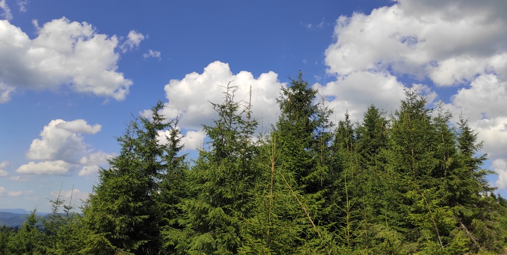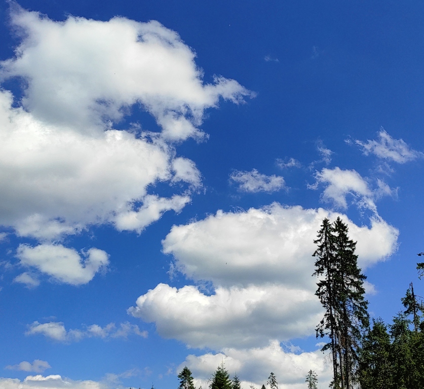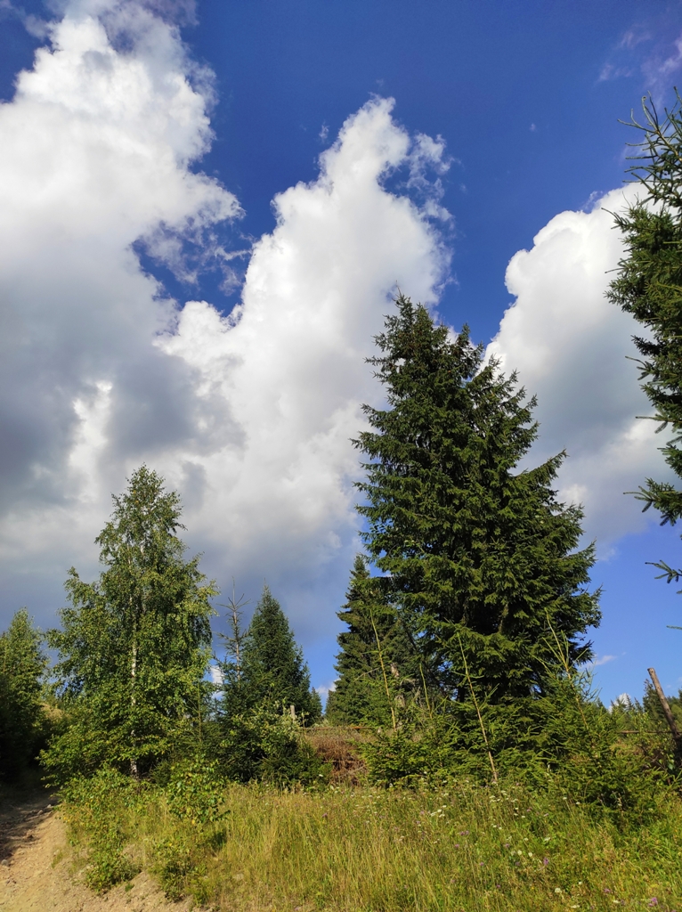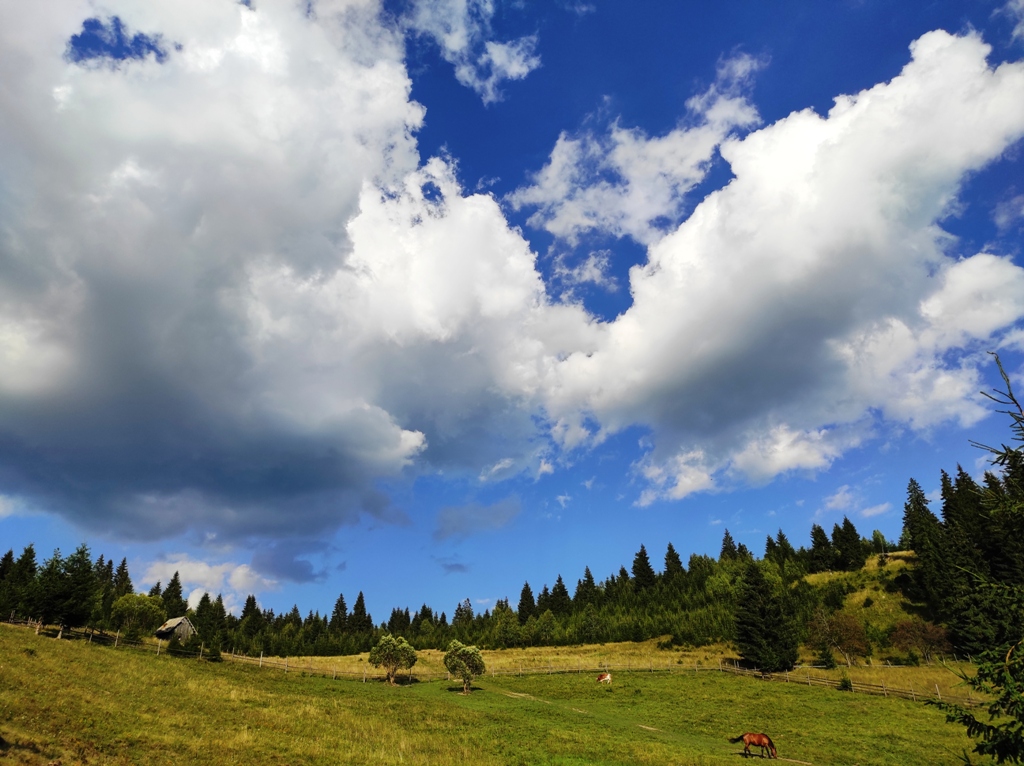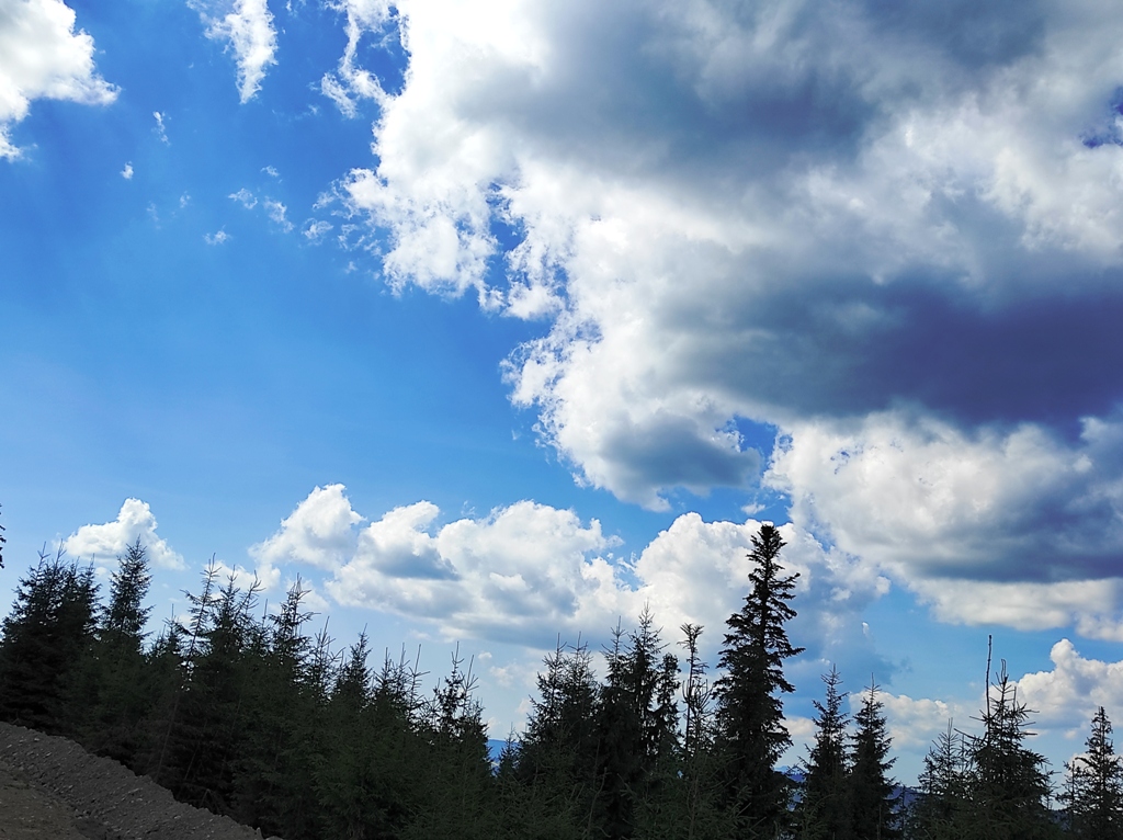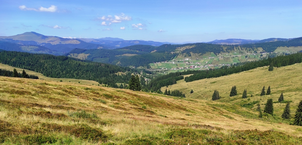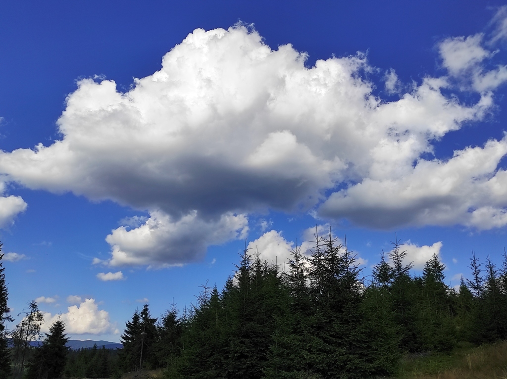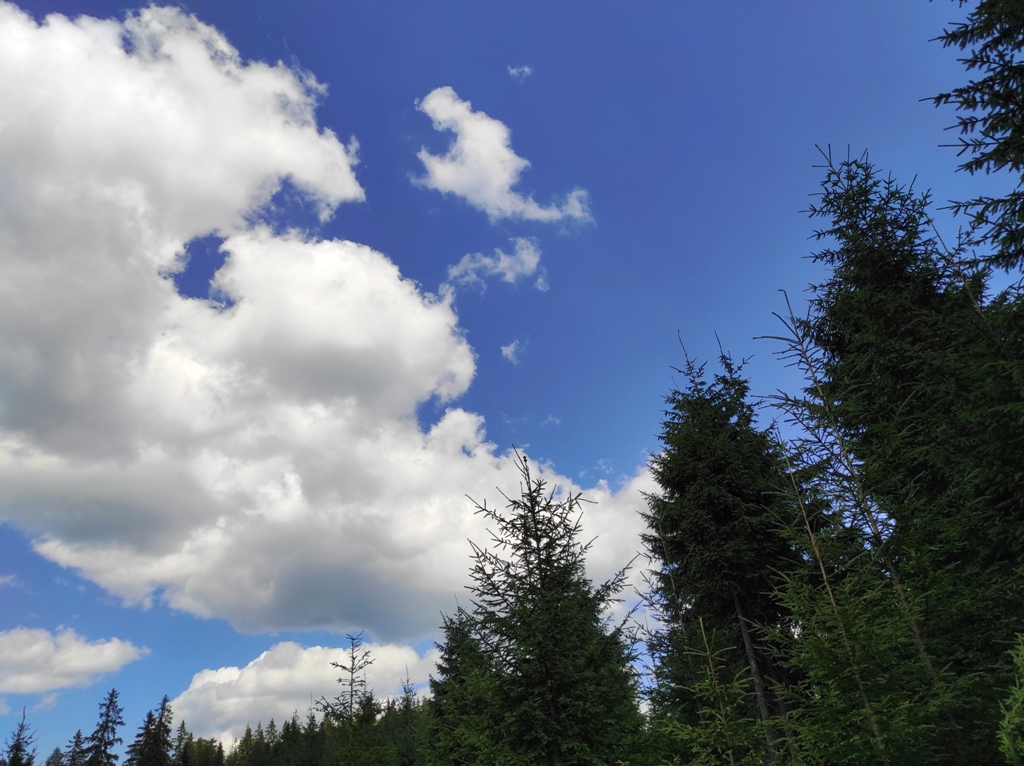Pornim și continuăm traseul prin Obcina Mestecăniș apoi intrăm în Tara Dornelor şi suntem din nou fascinaţi de mirificele peisaje ce ne sunt oferite privirii dar şi de formațiunile foarte ciudate de nori ce ne tot apar pe cer. Printre aceste așa zise entități identificăm și doi parașutiști sau parapantiști, apăruți parcă de nicăieri. Robert spune că au fost catapultați dintr-un avion pe care l-a văzut doar el. Mie mi se pare că au apărut din senin. Să fie oare extratereştri sau totuși fiinţe umane? Mai spune că era să calce și pe un șarpe sau viperă, și insistă aşa mult pe acest fapt încât şi mie mi se pare că văd un pui de urs care apare dar şi dispare rapid în tufișul de alături! O fi fost, n-o fi fost.. Cert este însă un lucru, am mâncat așa de multe afine, încât ne-am săturat.