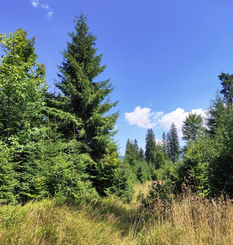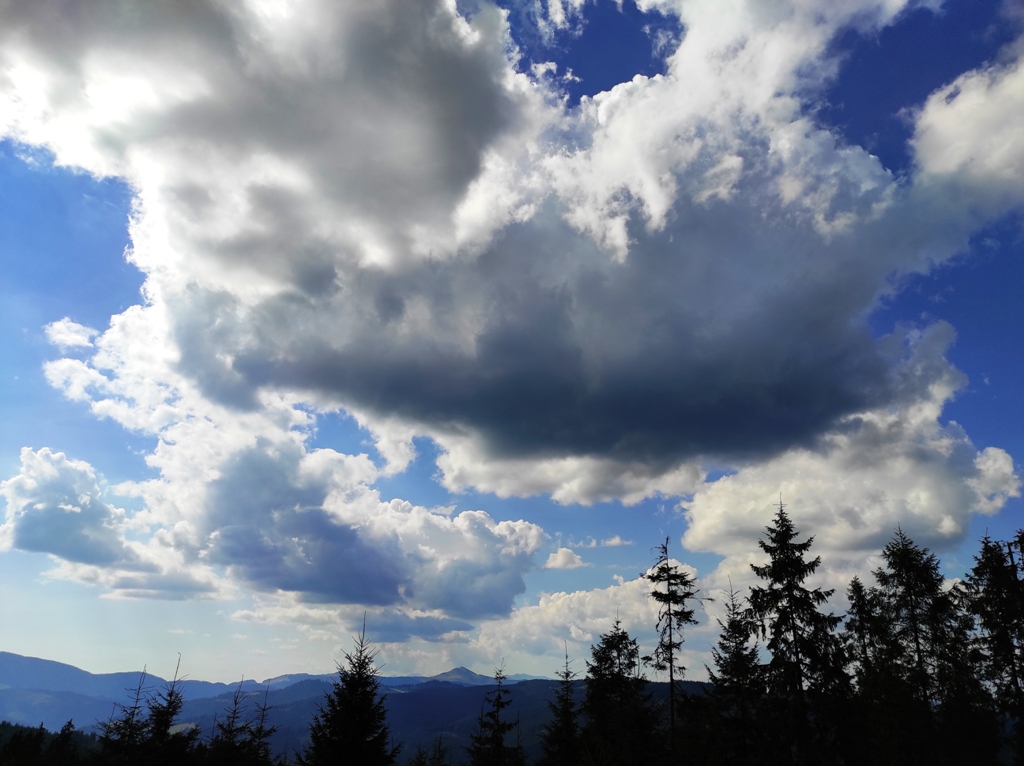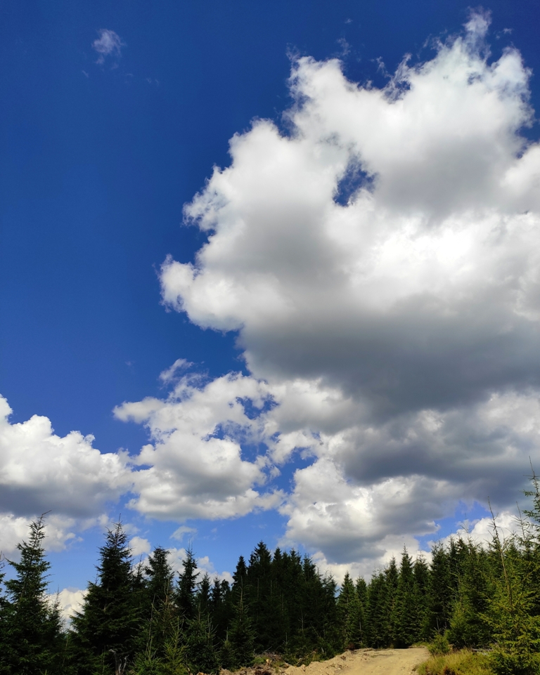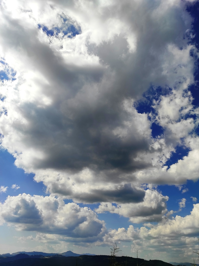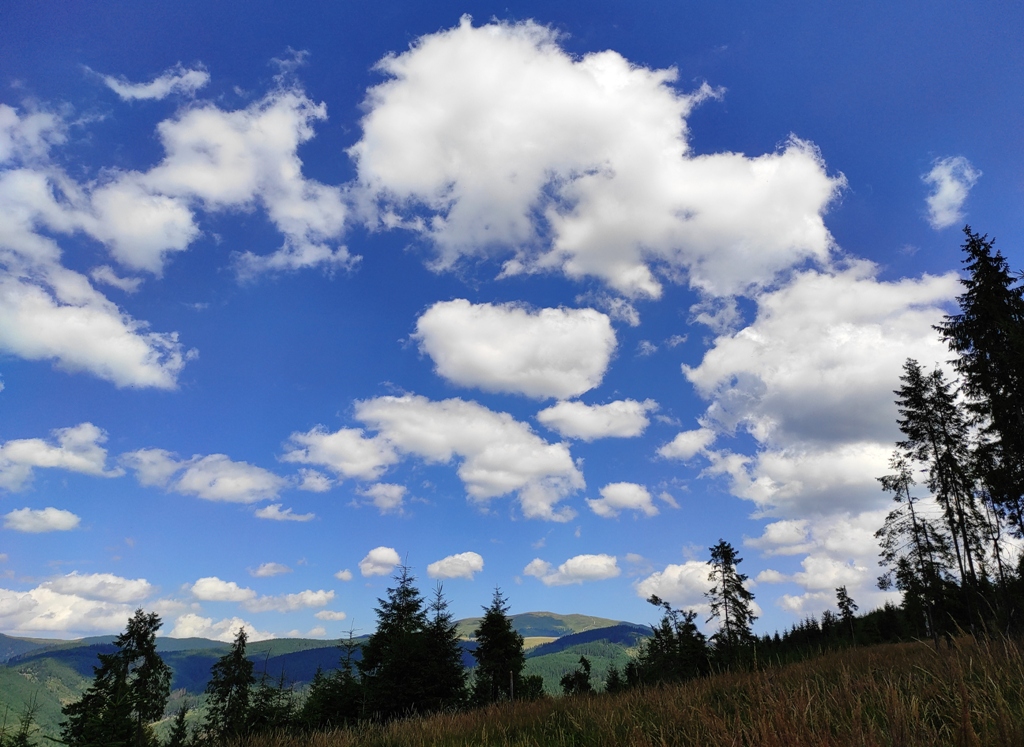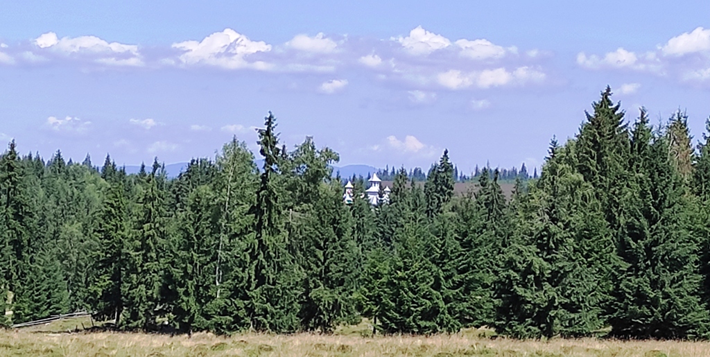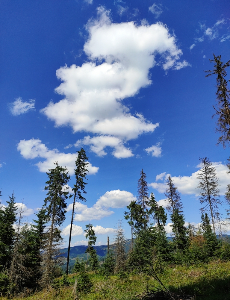 Pornim și continuăm traseul prin Obcina Mestecăniș apoi intrăm în Tara Dornelor şi suntem din nou fascinaţi de mirificele peisaje ce ne sunt oferite privirii dar şi de formațiunile foarte ciudate de nori ce ne tot apar pe cer. Printre aceste așa zise entități identificăm și doi parașutiști sau parapantiști, apăruți parcă de nicăieri. Robert spune că au fost catapultați dintr-un avion pe care l-a văzut doar el. Mie mi se pare că au apărut din senin. Să fie oare extratereştri sau totuși fiinţe umane? Mai spune că era să calce și pe un șarpe sau viperă, și insistă aşa mult pe acest fapt încât şi mie mi se pare că văd un pui de urs care apare dar şi dispare rapid în tufișul de alături! O fi fost, n-o fi fost.. Cert este însă un lucru, am mâncat așa de multe afine, încât ne-am săturat.