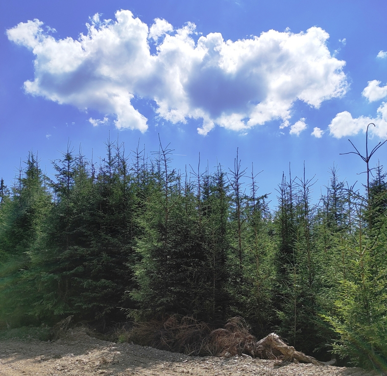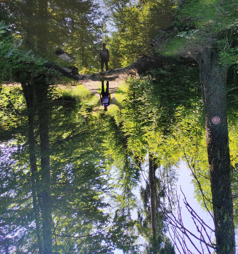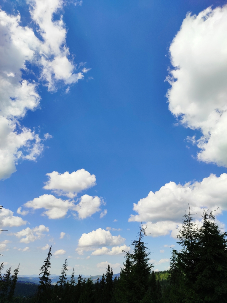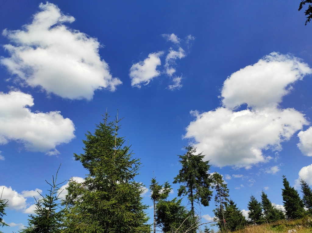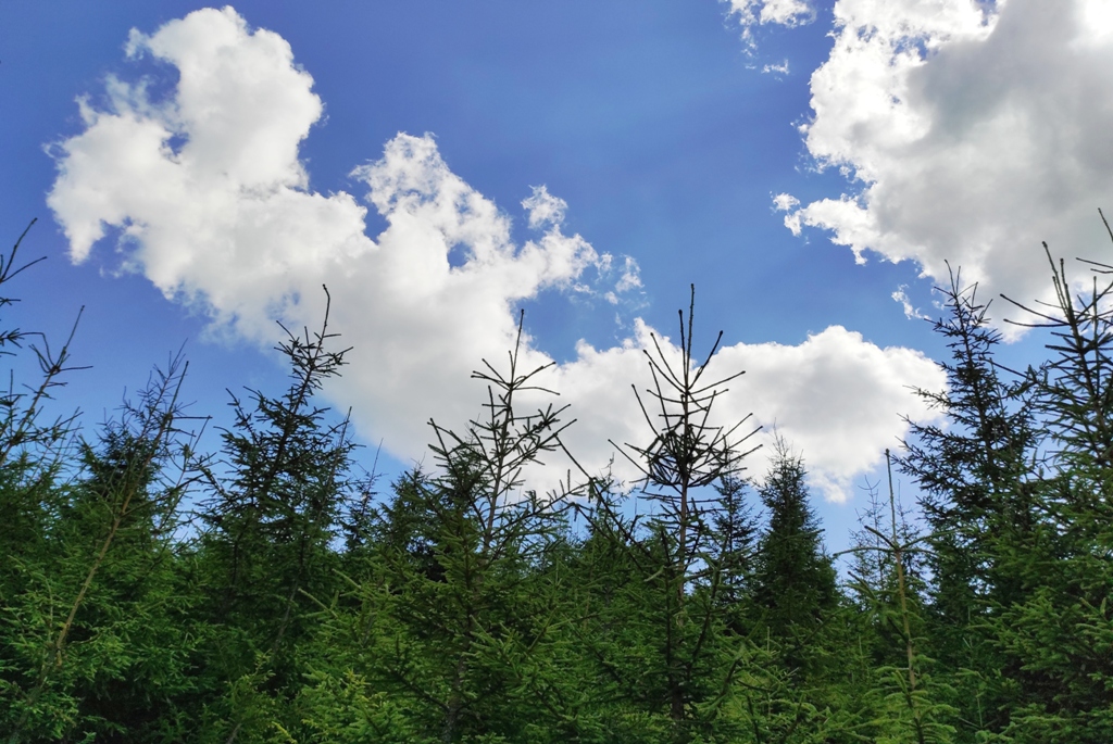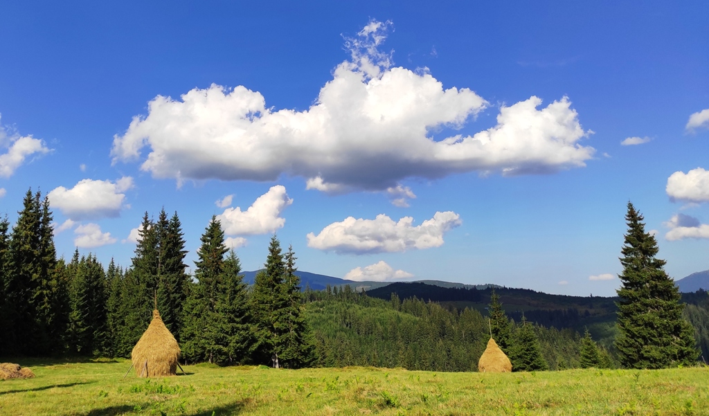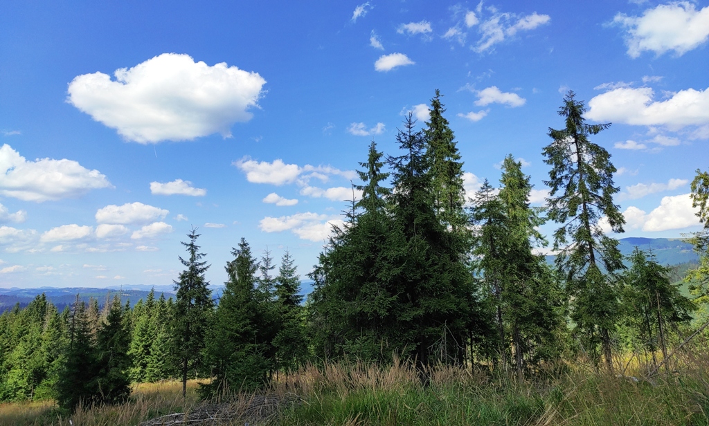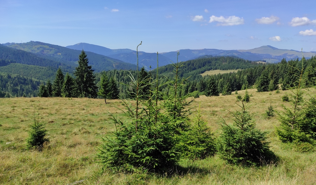 Pornim și continuăm traseul prin Obcina Mestecăniș apoi intrăm în Tara Dornelor şi suntem din nou fascinaţi de mirificele peisaje ce ne sunt oferite privirii dar şi de formațiunile foarte ciudate de nori ce ne tot apar pe cer. Printre aceste așa zise entități identificăm și doi parașutiști sau parapantiști, apăruți parcă de nicăieri. Robert spune că au fost catapultați dintr-un avion pe care l-a văzut doar el. Mie mi se pare că au apărut din senin. Să fie oare extratereştri sau totuși fiinţe umane? Mai spune că era să calce și pe un șarpe sau viperă, și insistă aşa mult pe acest fapt încât şi mie mi se pare că văd un pui de urs care apare dar şi dispare rapid în tufișul de alături! O fi fost, n-o fi fost.. Cert este însă un lucru, am mâncat așa de multe afine, încât ne-am săturat.
