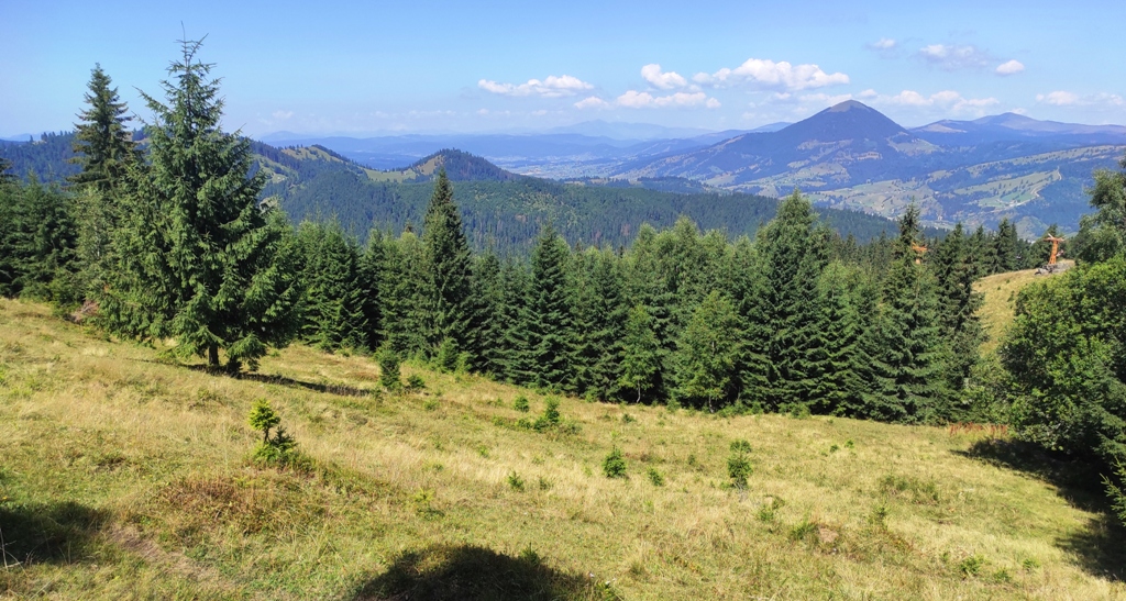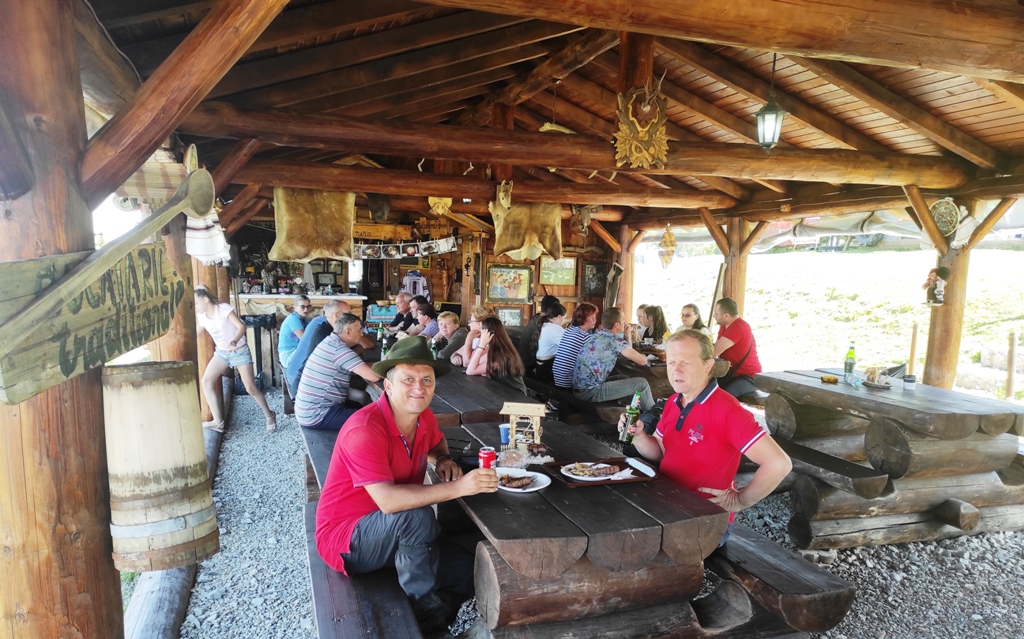 Ne revenim, însă, repede când ajungem sus și e ca la bâlci. Bere multă, fripturică la greu, de toate. Robert nu rezistă ispitei și ia mici, mie îmi oferă doi, el mai mulţi că are valoare. Apoi pornim la drum cu burta plină, dar nu mergem mult că într-o poieniță ne ia somnul și adormim câteva minute! Cu forţe proaspete coborâm la vale apoi urcăm din nou dealul şi ajungem în Dorna Cândrenilor, unde iar avem parte de alte peisaje magnifice de îţi taie respiraţia, dar acum ele sunt acompaniate şi de un fond de muzică de petrecere, de se aude aşa de tare încât răsună valea până mult în depărtare. Pesemne muzica provine de la vreo nuntă bucovineană dar nu putem spune deloc că nu ne-a plăcut. Deasupra tuturor se află însă Oușorul din Suhard care ne călăuzeşte si el mult timp în drumul nostru până când ajungem în Poiana Negrii, şi poate mai departe ar fi voit să mergem împreună, dar aici noi trebuie să ne oprim. Am ajuns la capătul Bucovinei şi ce experienţă minunată am avut!