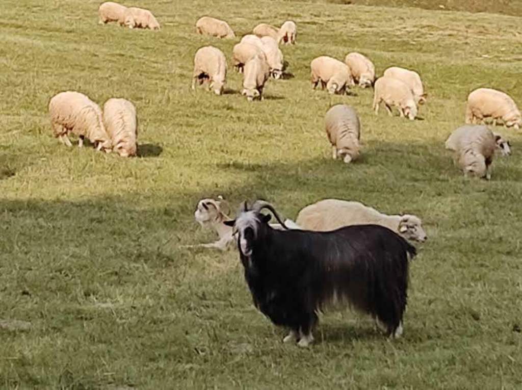 Apoi peste câteva dealuri îl cunoaștem și pe Niculae care este cu o imensă turmă de oi, câini şi capre, are doar 27 de ani, dar eu îi dau cel puţin 50. Facem şi nelipsita poză de protocol apoi suntem onoraţi să îl cunoaştem şi pe țapul Dănuț, şeful caprelor, falnic bărbat trebuie să recunoaştem! Ne încercăm și aparatul cu ultrasunete pentru câini, mie mi se pare că funcționează, Daniel zice că nu. E al lui, şi cu această ocazie mi-l face cadou. Apoi ne luptăm şi cu un, destul de incomod, drum pietruit, care ne cam dă ceva bătaie de cap! Dar ajungem, în sfârșit, la Tăşuleasa ![]()