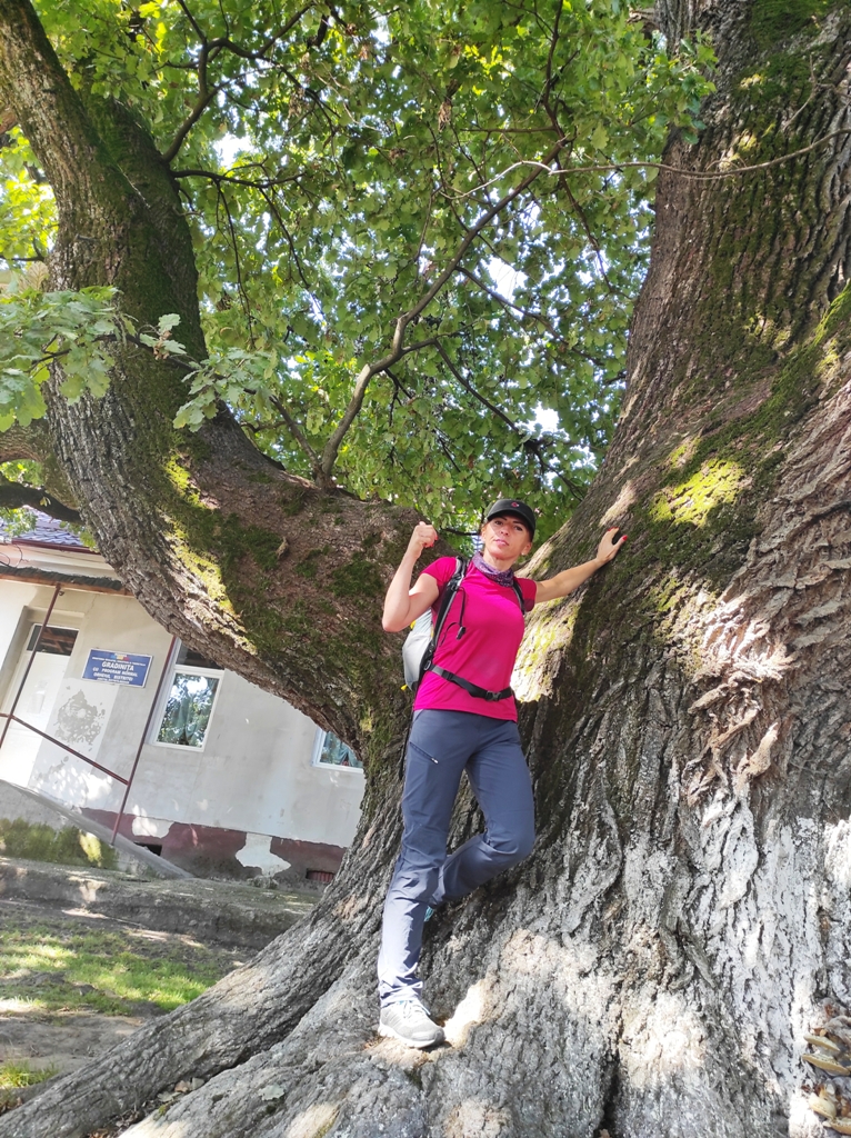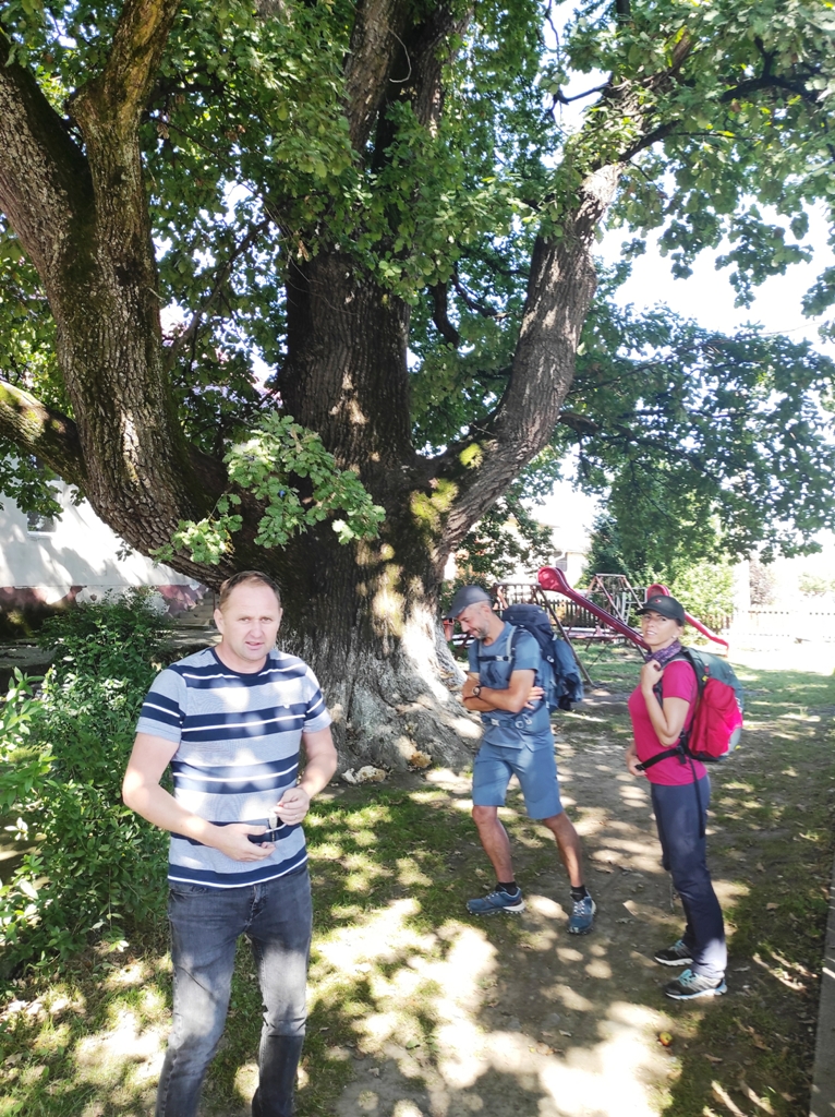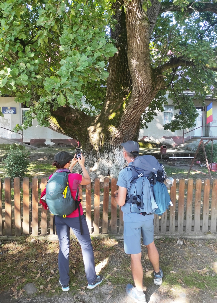 Plecăm de la gazda noastră, trecem pe la magazinul din sat, apoi peste podeţul care ne dă impresia că din clipă în clipă aşteaptă să cadă în râul peste care trecem, ajungem la copacul uriaș la care tot te uiţi şi nu se mai termină deloc, până când apare un inginer silvic, răsărit parcă din pământ, care ne spune că bătrânul veteran, ar fi în vârstă de cam 600-700 de ani și că ar fi fost plantat de vechii sași ce au locuit aici, pentru a le face umbră la vite. Şi nouă ne prinde bine umbra copacului că nu ne mai vine să plecăm de sub el, dar nu putem rămâne prea mult că mai avem drum lung de parcurs.