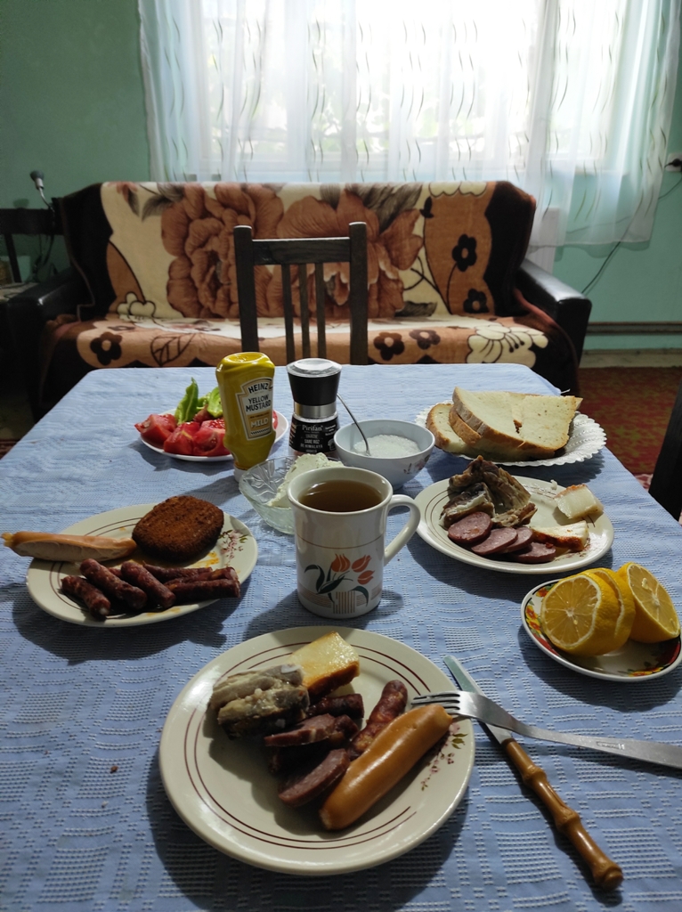 Doamna Geta sau Geta cum îi place să i se spună, ne pregătește la micul dejun o mândrețe de mămăliguță cu brânză și cu șuncă și cu alte multe altele, cărora li se spune pături. Eu n-am mâncat niciodată în viața mea așa ceva, dar mi se par bune rău păturile astea.