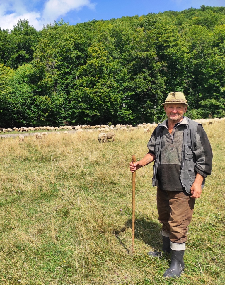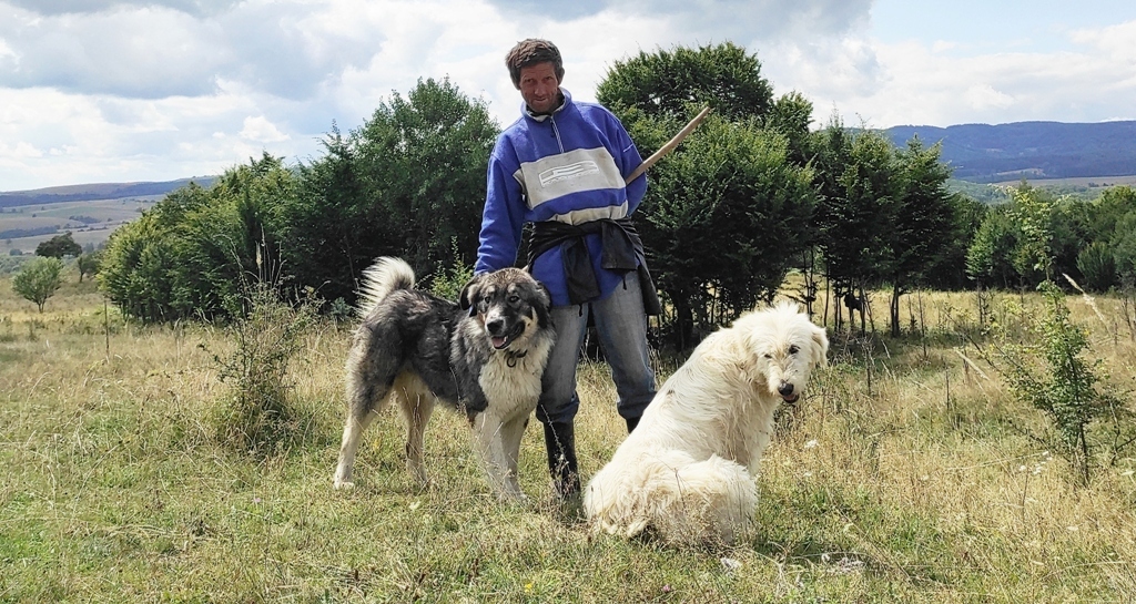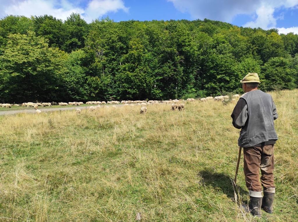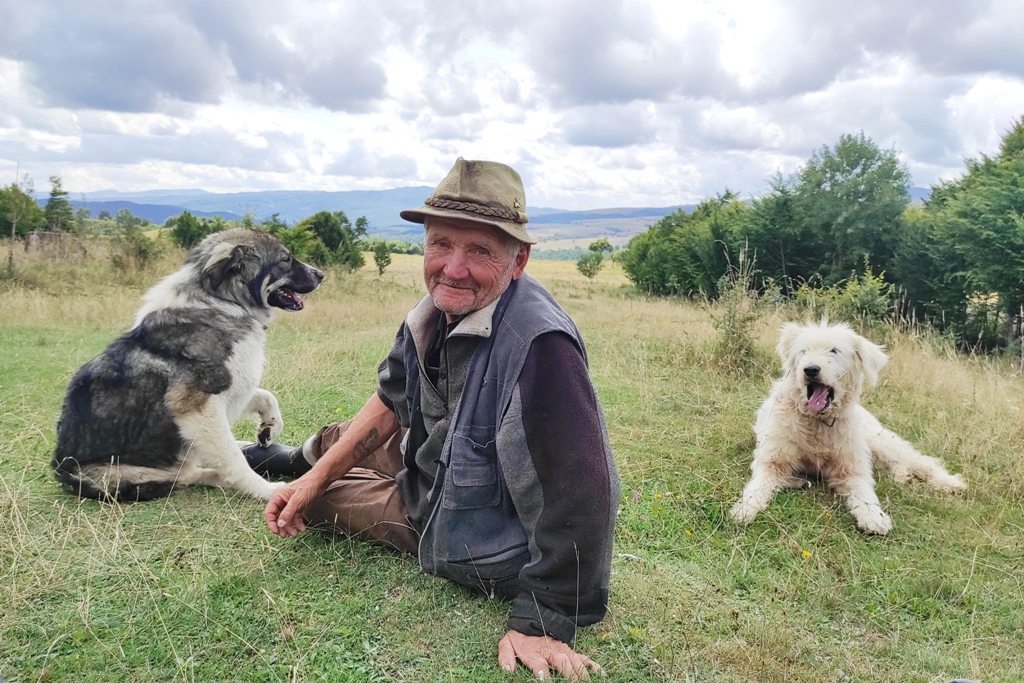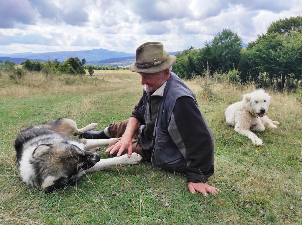 Pornesc, totuși la drum pe o vreme superbă și nici o urmă de urs, nici măcar cât ai face o poză… în schimb îmi amintesc că astăzi este Ziua Câinelui și fac cumva să nu le stric petrecerea când mă apropii prea mult de ei. Ocolesc stânele cât pot de mult, dar până la urmă tot dau nas în nas cu ditamai turma de oi și cu niște câini sărbătoriţi. Dar acolo este nea Iosif, un cioban de vreo 74 de ani care spune că are 8 copii, 4 fete și 4 băieți și că toți sunt la casele lor răspândiţi prin toată lumea. Ajutorul său este Zoli, mult mai tânăr, care nu știe românește deloc.