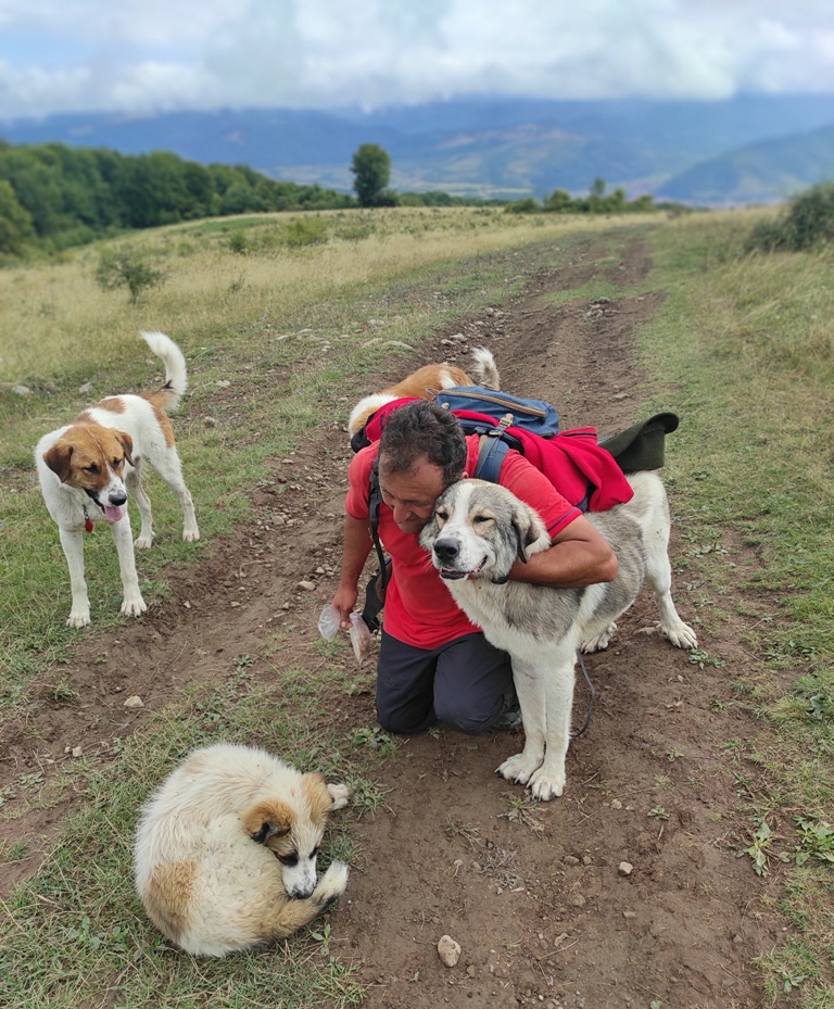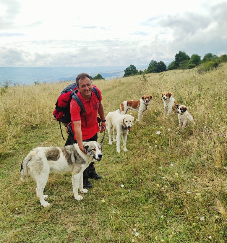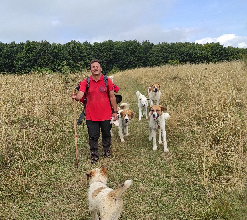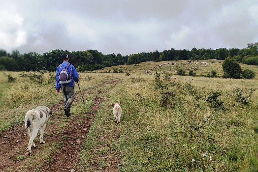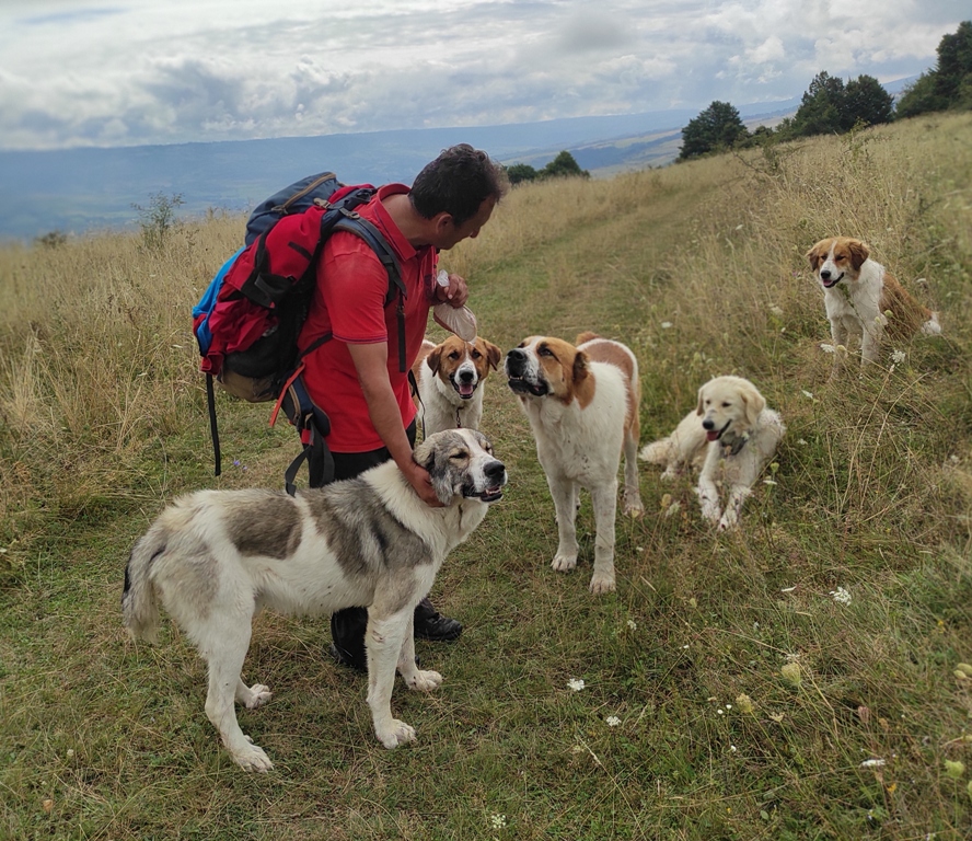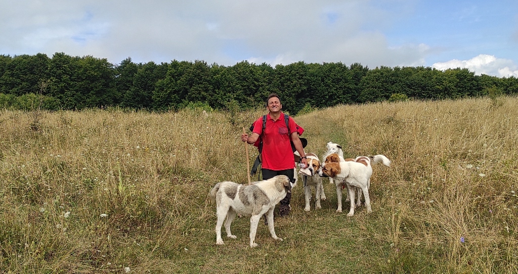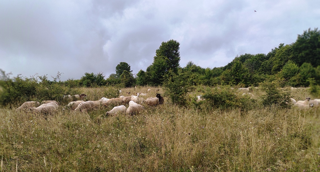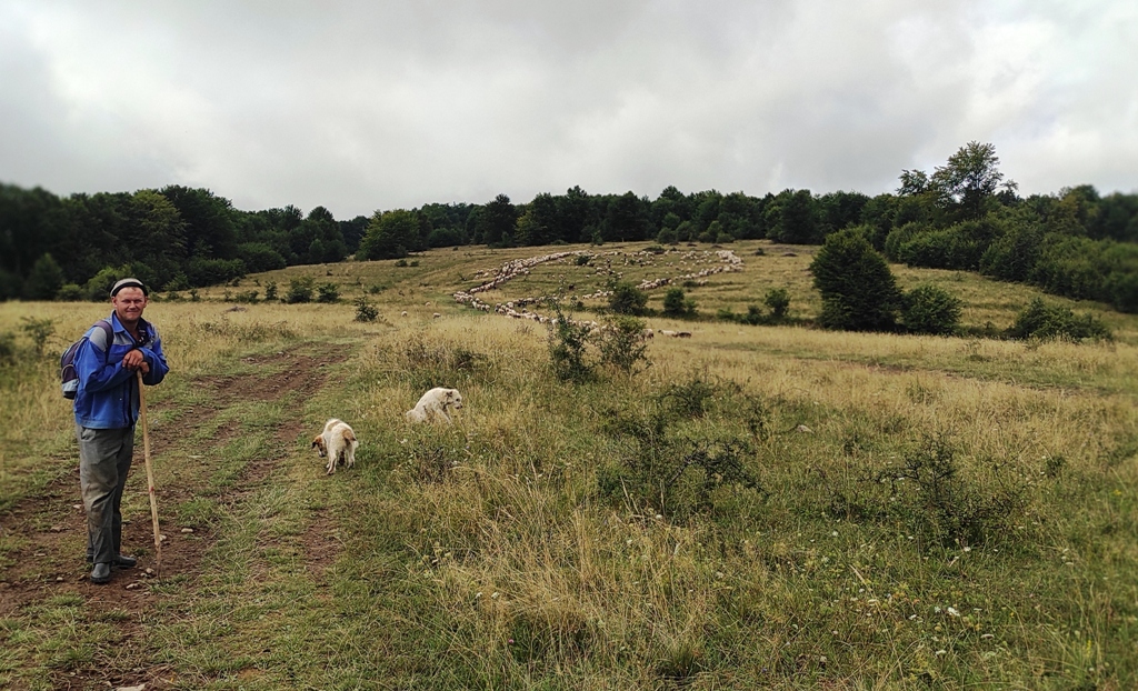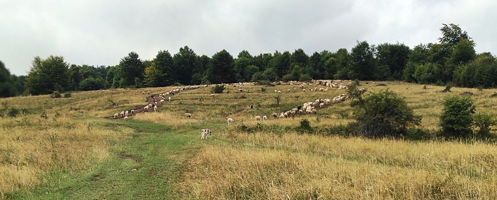 Greu mi-a mai fost să mă despart de această comunitate de vâlcenii, dar până la urmă tot a trebuit să o fac şi să pornesc prin pădurea deasă plină de urși, cum se spune mereu pe aici, dar tot ajung până la urmă la o turmă de oi iar traseul Via Transilvanica trece exact prin mijlocul lor. Dintr-o mă pomenesc cu vreo 16 patrupezi unul mai frumos decât celălalt care năvălesc asupra mea să mă rupă nu altceva, dar ei desigur că încearcă să-și apere suratele oi și capre de intrus, adică de mine, şi aproape că reuşesc să o şi facă, dar noroc că în ultima clipă apare un ciobănaș tinerel pe care îl cheamă Iulian ce provine de prin judetul Bacău, și care și-a găsit o fată bună în Harghita și s-a mutat la ea. Spune că acolo în Bacău, nu sunt fete așa harnice ca aici, și că acelea care sunt, stă numai cu ochii în oglindă și au unghiile făcute..