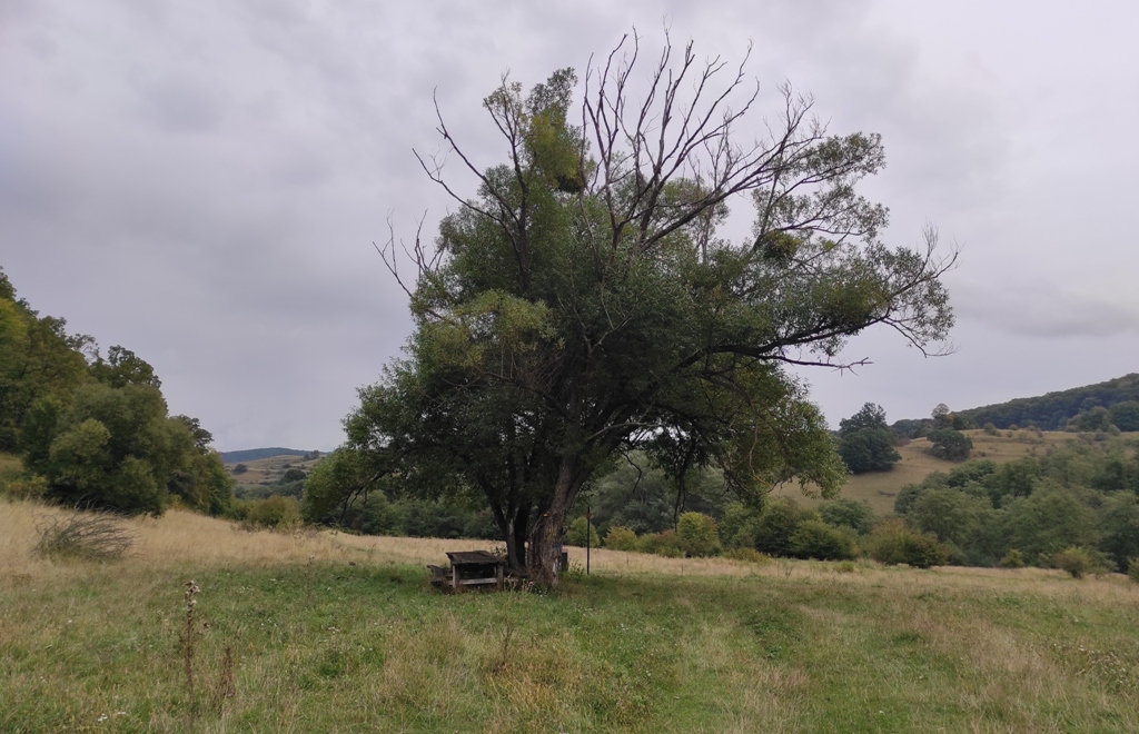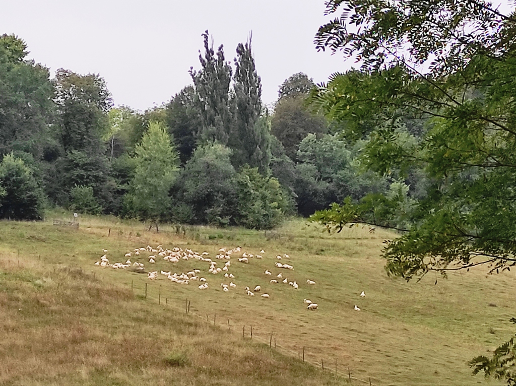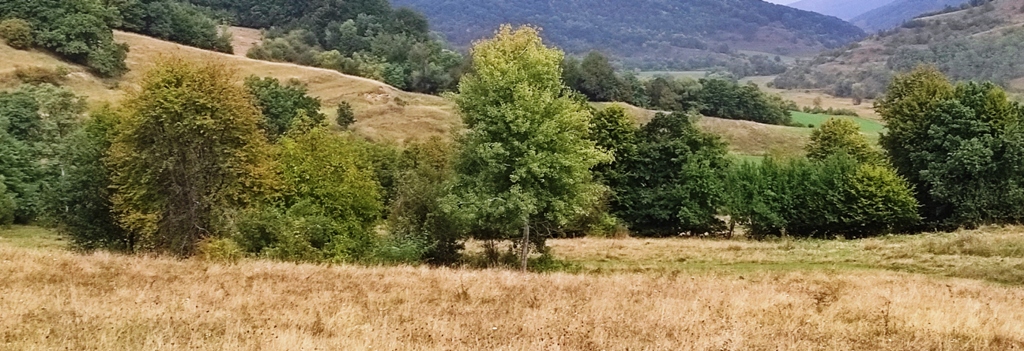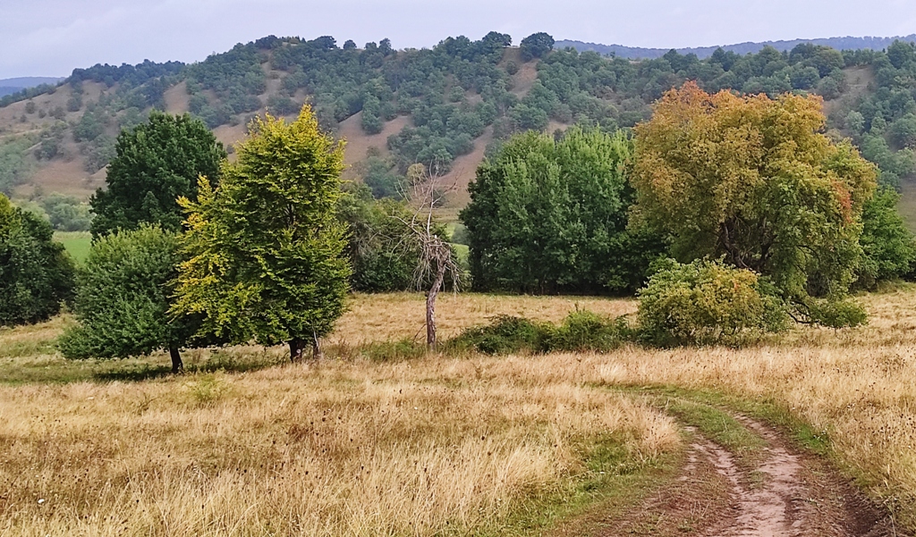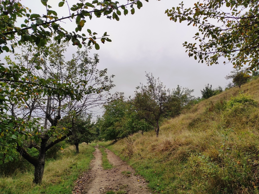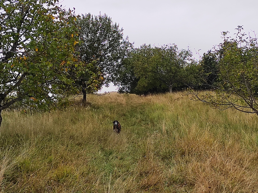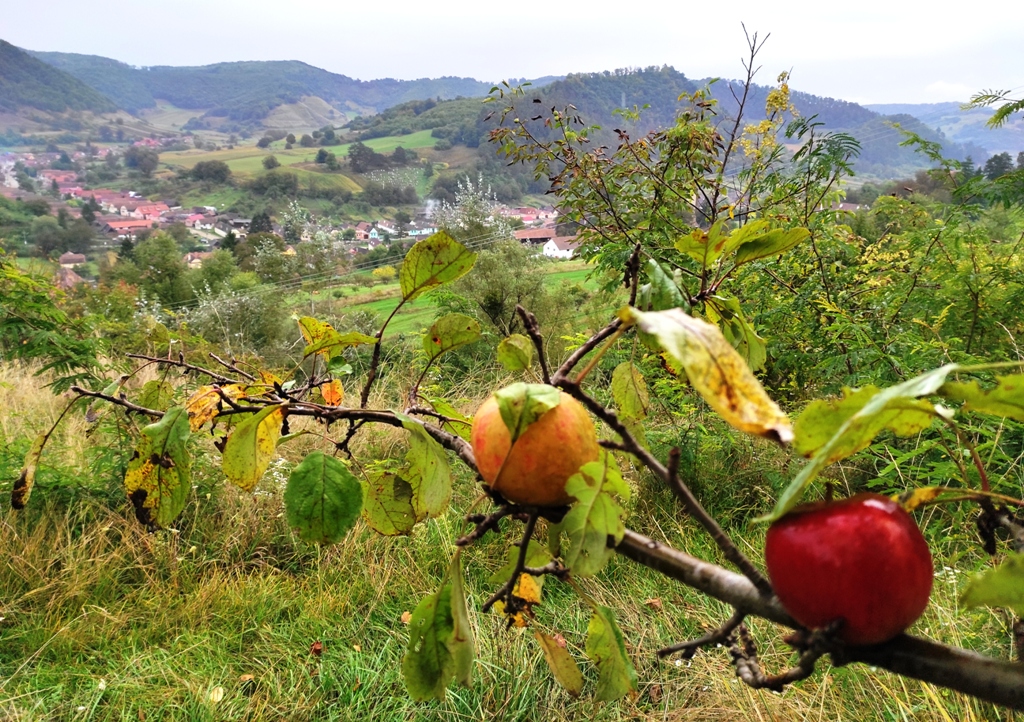 Plec împăcat și ajung în livada unde acum două zile a avut loc festivalul sucului de mere, și cu ochii ba după mere roșii ba după cele galbene, mă pomenesc că mă abat de pe traseu, dar când mă întorc, în fața mea apare o turmă de oi și sigur are și câinii, încerc să îi evit ocolindu-i și aleg câteva urcușuri pronunțate, dar când cred că sunt pe drumul cel bun apare în fața meu un câine care se uita așa de fix la mine și mai are și un guler alb la gât, încât aproape cred că este ursul de acum câteva zile.