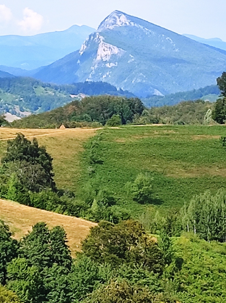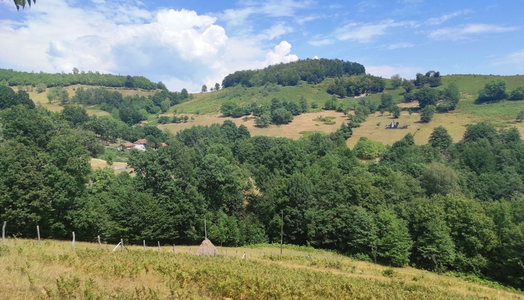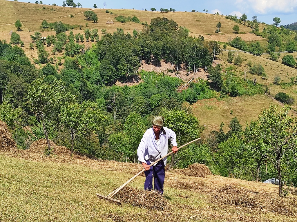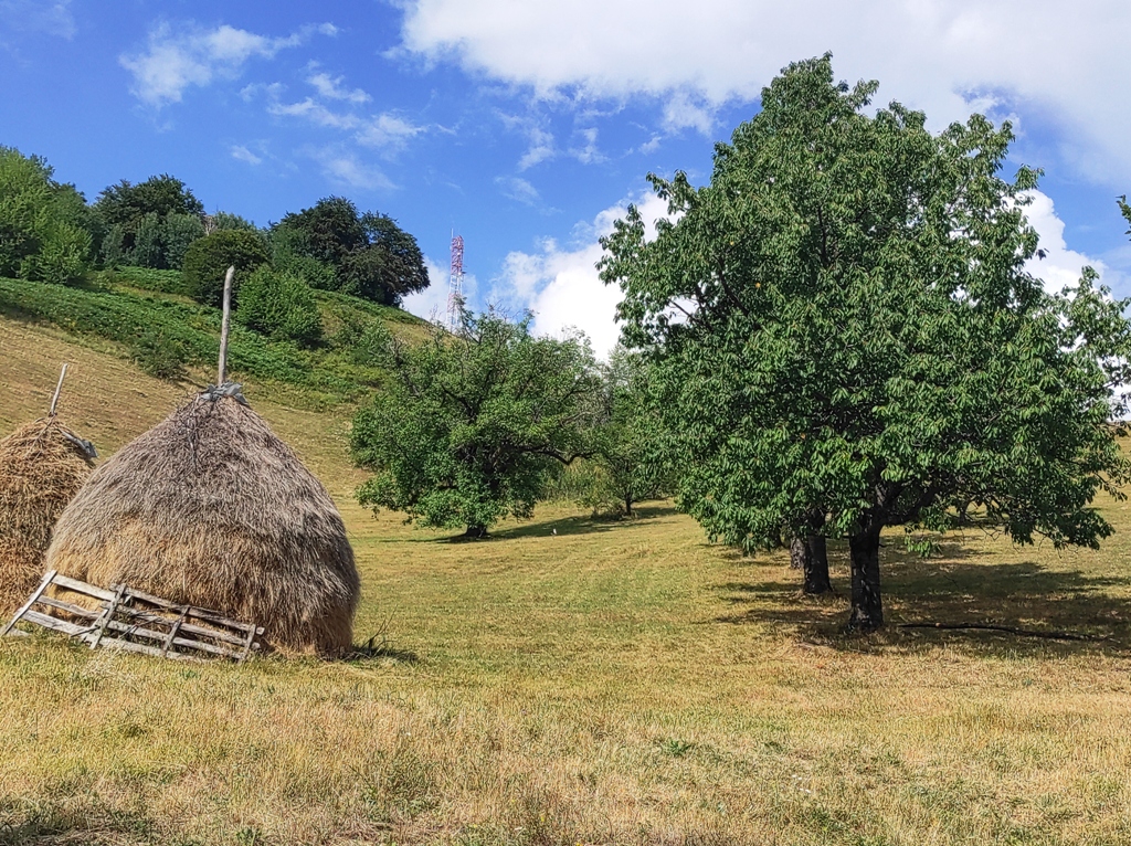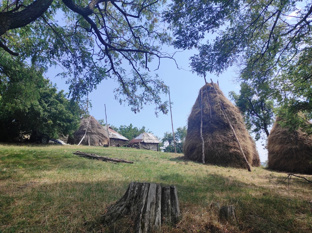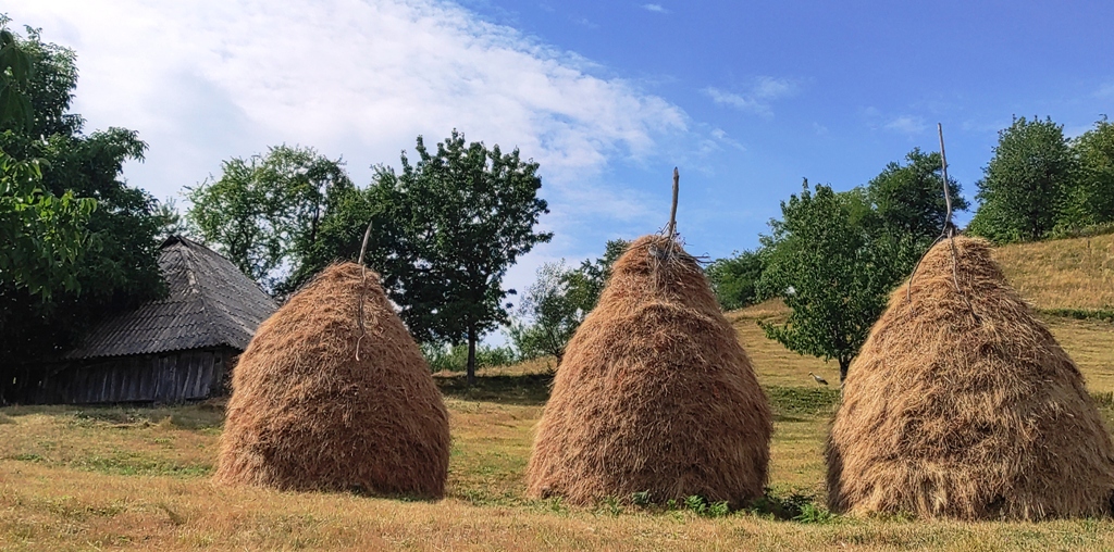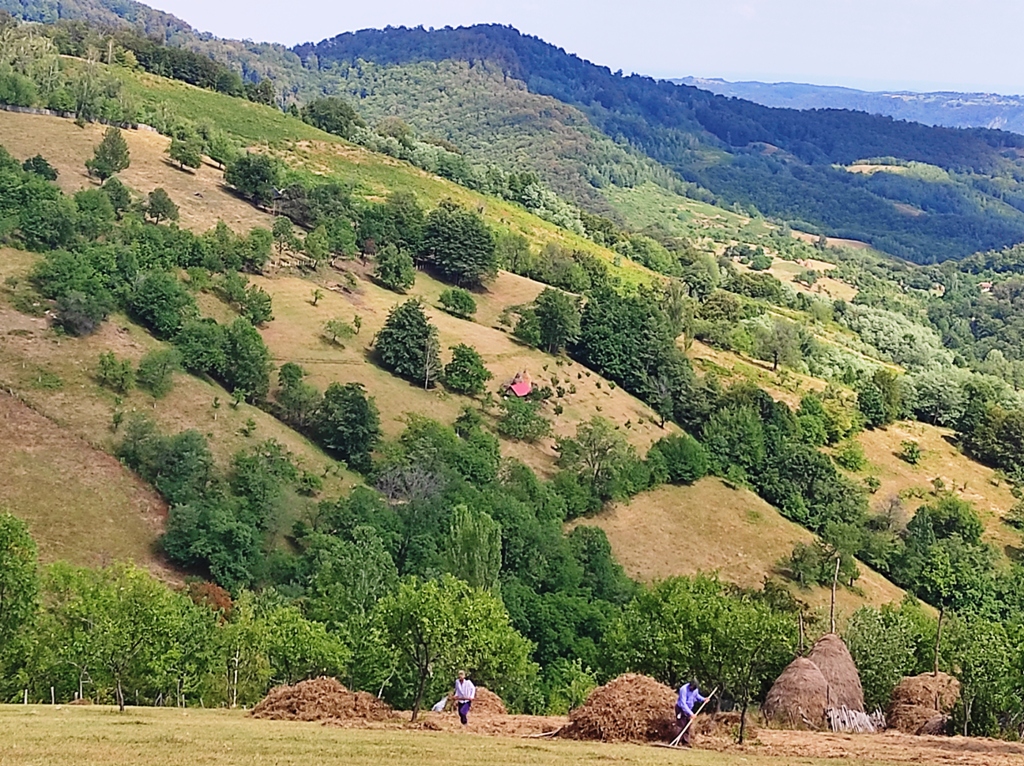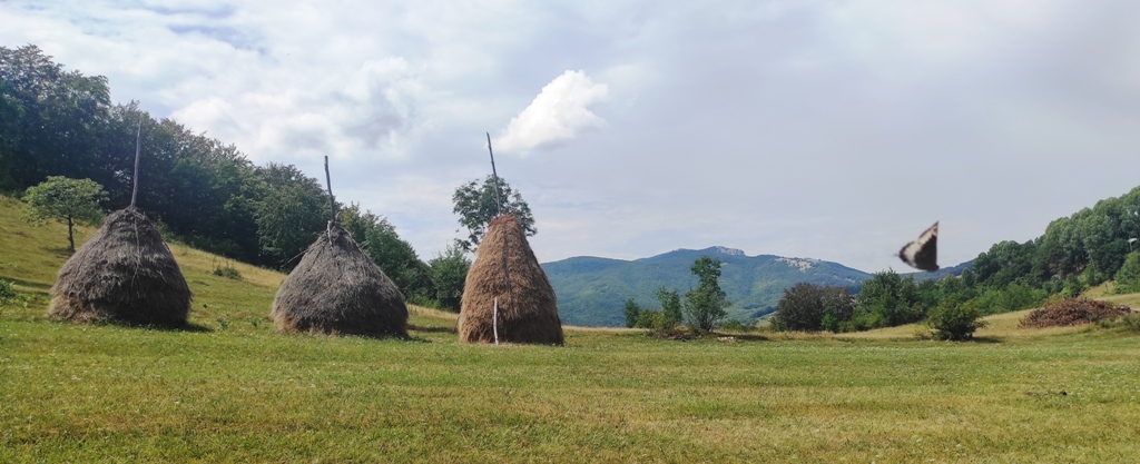 Părăsesc până la urmă Isverna și când ajung în vârful dealului deasupra satului Drăghești îi găsesc la adunat de fân pe Dan Popescu și pe mama sa tanti Olimpia. Nu ezit să le ofer o mână de ajutor, măcar cât a face o poză iar apoi am marea surpriză să constat că nea Dan mă cunoaște de când era cu oile prin Poiana Beletina iar eu venisem cu un grup din Arad în drumeție prin Munții Mehedinți. Ca să vezi ce mică e lumea.