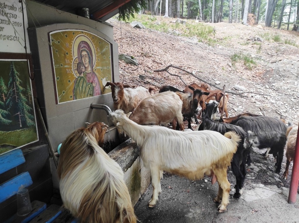 Ajung la binecunoscuta fântână cu apă rece de deasupra Obârșiei și nu zăbovesc prea mult în singurătatea mea că mă pomenesc dintr-o dată că apar vreo 130 de capre ce năvălesc peste mine, şi care, după ce trec şi ignoră cu seninătate prezenţa mea pe acolo, se aşează tare cuminți la rand ca să bea apă, însă cele mai multe profită de timpul liber apărut pe neaşteptate și se întind pe asfalt, nu rezist ispitei și mă așez și eu, că doar nu strică un pic de odihnă în plus!
