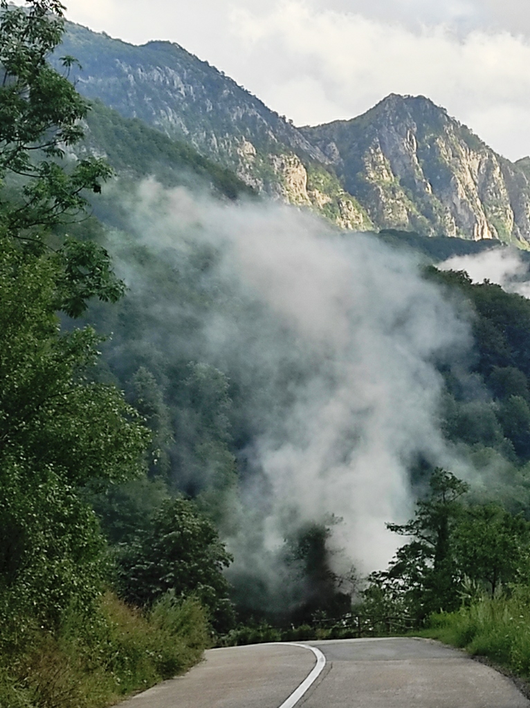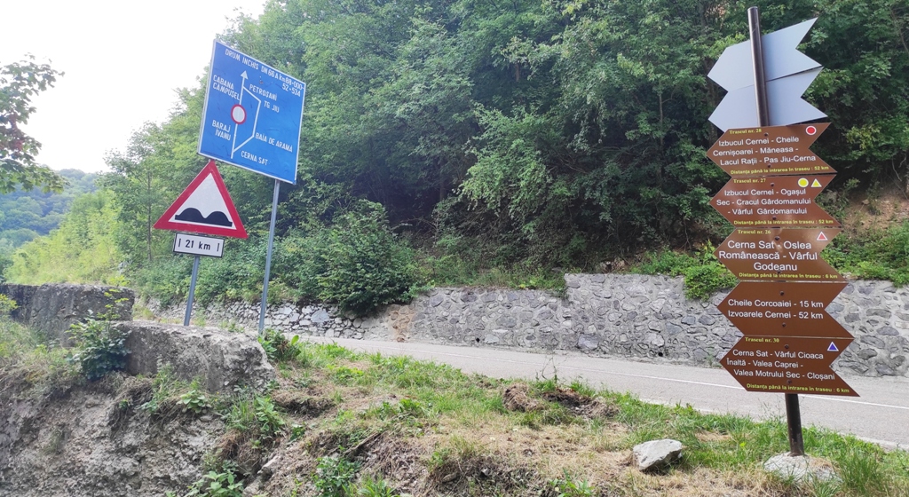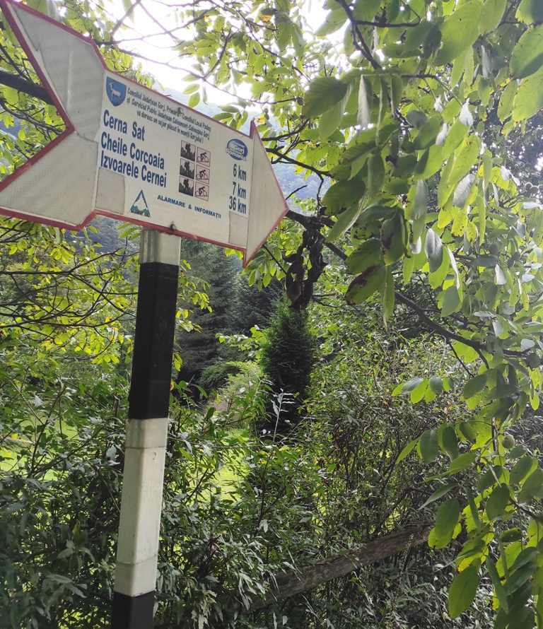 După o coborâre aproape fără de sfârșit, ajung jos și văd pe un indicator că mai este doar un kilometru până la Cerna Sat și cam 42 până la izbucul Cernei dar nu apuc să mă dumiresc prea bine de ce se află în jurul meu, că mă şi pomenesc înconjurat de vreo patru câini destul de agresivi, noroc însă cu doamna Florența Achim rudă cu nea Gheorghe, care sare la ei şi mă salvează de prietenii patrupezi.