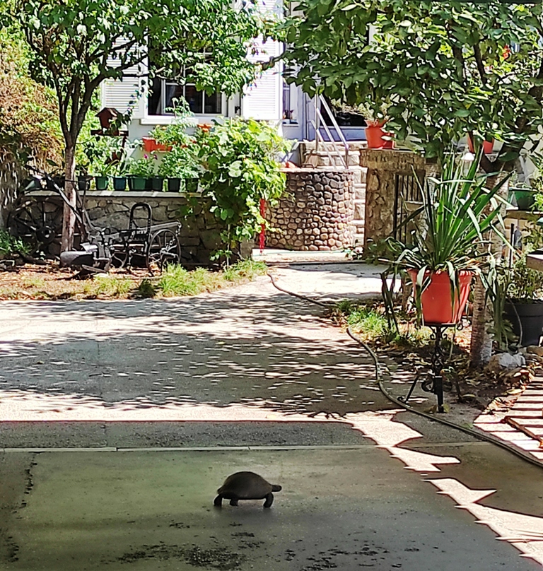 Revenind imediat cumva la realitate, observ în fața mea o ditamai broască țestoasă circulând liber prin curte, un câine uriaș care își dorește să mă înhațe dacă i s-ar da drumul și o drăgălășenie de pisică cu pisoi frumoși foc care voiesc cu tot dinadinsul să fie mângâiați.