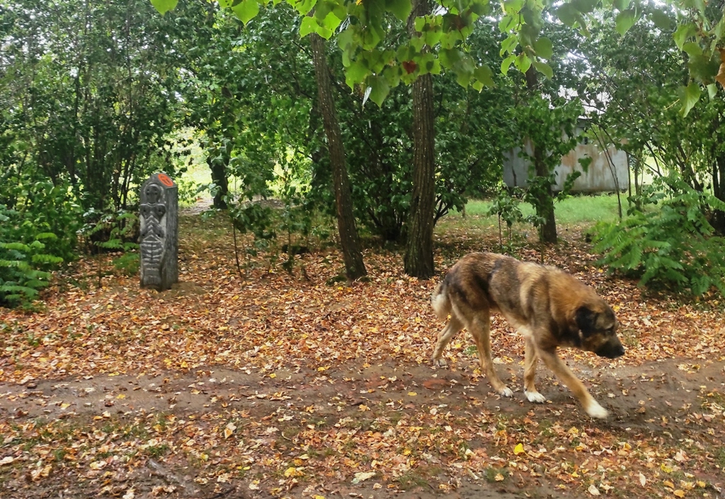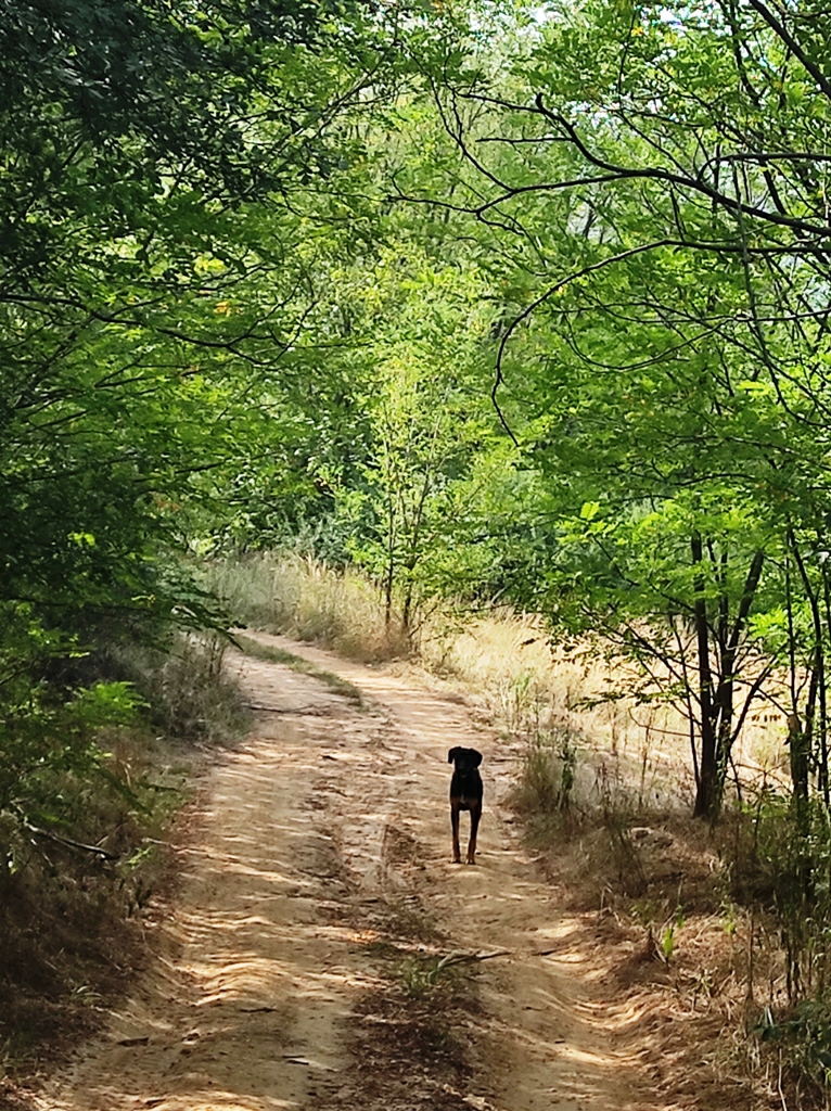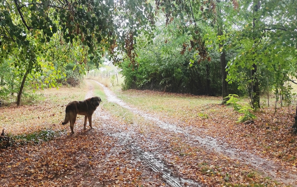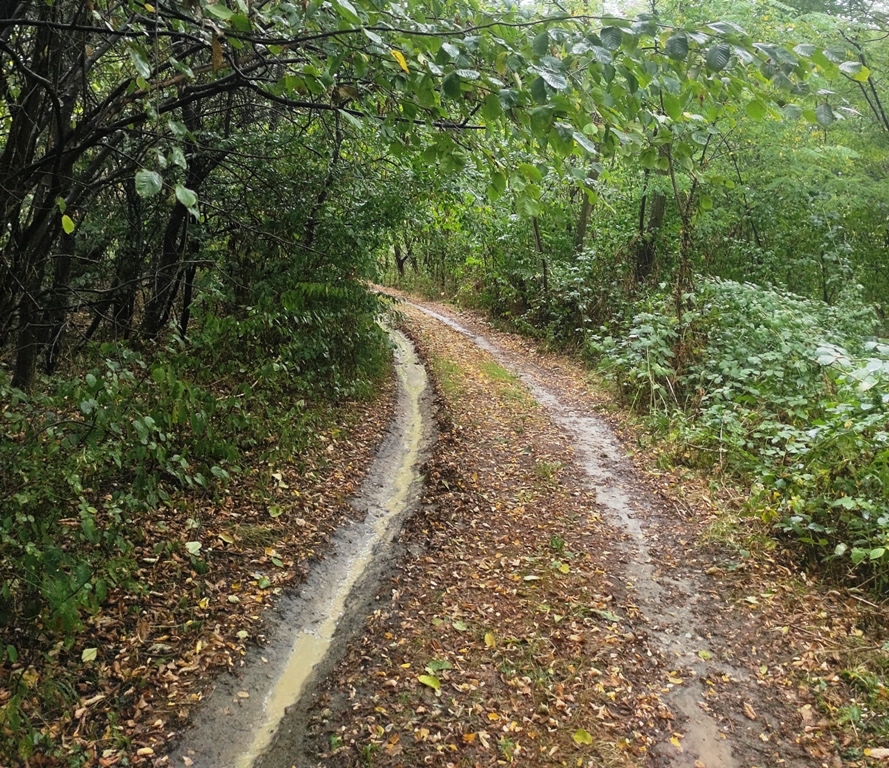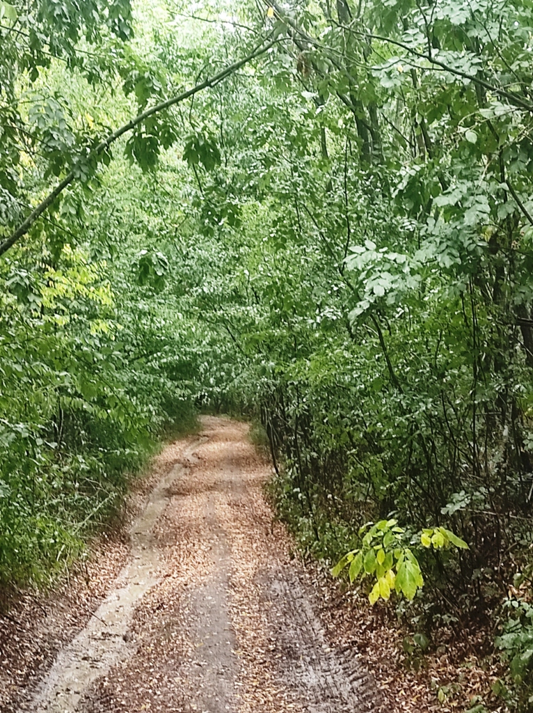 Pornesc mai departe, fac undeva un popas, mai la umbră că e căldură mare și dintr-o dată privind spre cer, nori grei observ și tunete în depărtare și plec repede de acolo dar nu ajung decât până în pădure și începe potop mare, încerc să mă adăpostesc sub niște copaci, o mașină și un tractor vor să mă ia cu ei dar merg în sens invers, îmi scot și umbrela îmi protejez și rucsacul dar intră și un păianjen uriaș ca să se apere de ploaie, îl las și pe el că și el e ființă.