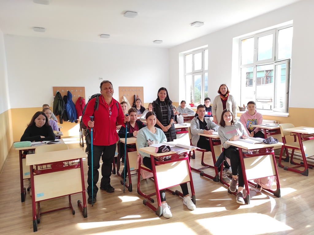 M-am simțit excelent și în compania primarului frumoasei comune, domnul Dan Aldea, cu care după ce am servit o cafea în biroul său și după tradiționala poză din fața primăriei, ne-am deplasat împreună la școala din localitate unde am întâlnit-o pe doamna directoare Camelia Rotar și ea călătoare pe Via Transilvanica. Împreună am mers într-o sală de clasă la o oră de matematică a doamnei profesor Viorica Basaraba, unde în doar câteva minute am încercat să le împărtășesc elevilor câte ceva din experiența mea pe Via. Și cred că le-a plăcut tare mult.