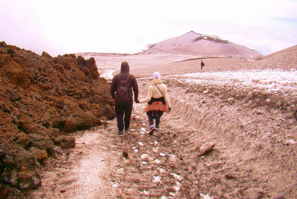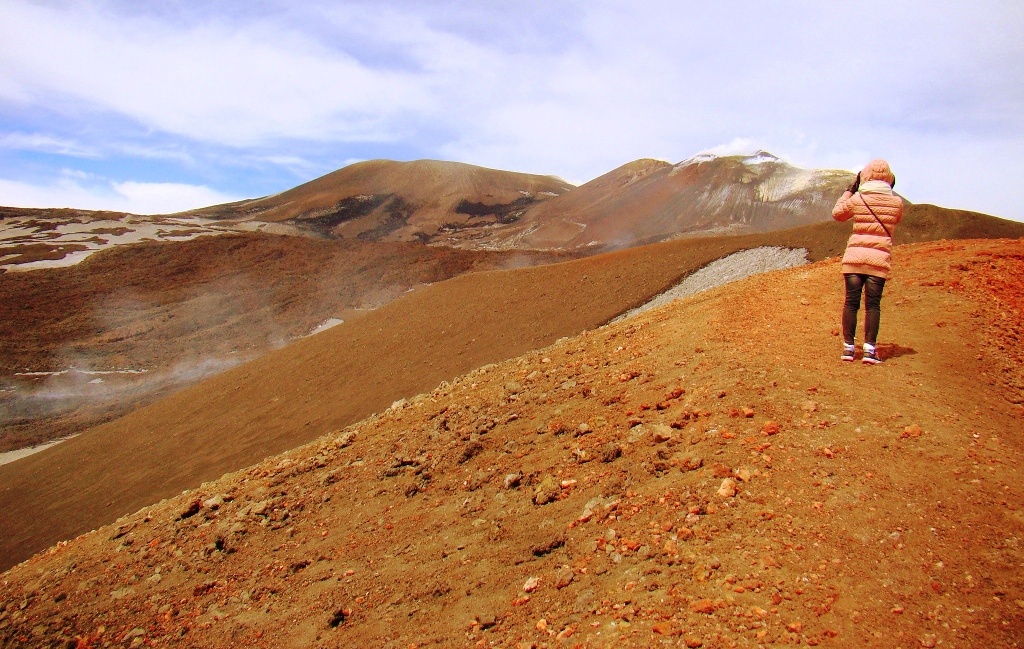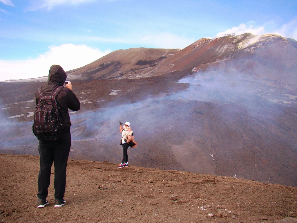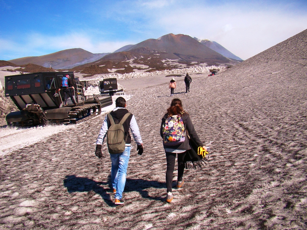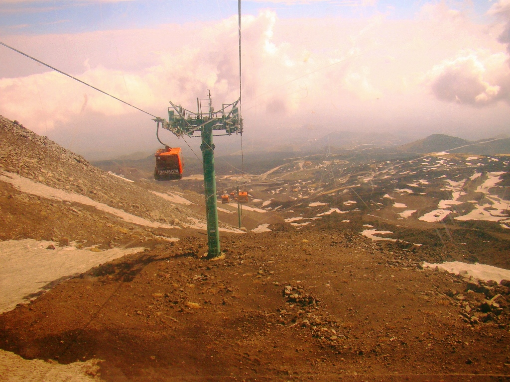 Așa că într-o dimineață, dintr-un alt timp, pornesc din autogara Piazza Giovanni XXIII, aflată lângă gara Catania Centrale, cu singurul autobuz care urcă spre Etna, până la Rifugio Sapienza, la peste 1900 de metri altitudine. De acolo iau telecabina până la 2500 de metri, iar mai departe… pe jos. Sau cu niște mașini de teren care costă cât o vacanță în Grecia. Așa că aleg varianta clasică: mersul pe jos. Și nu doar eu, căci toți fac cam la fel.