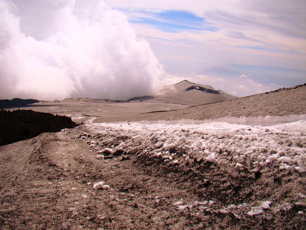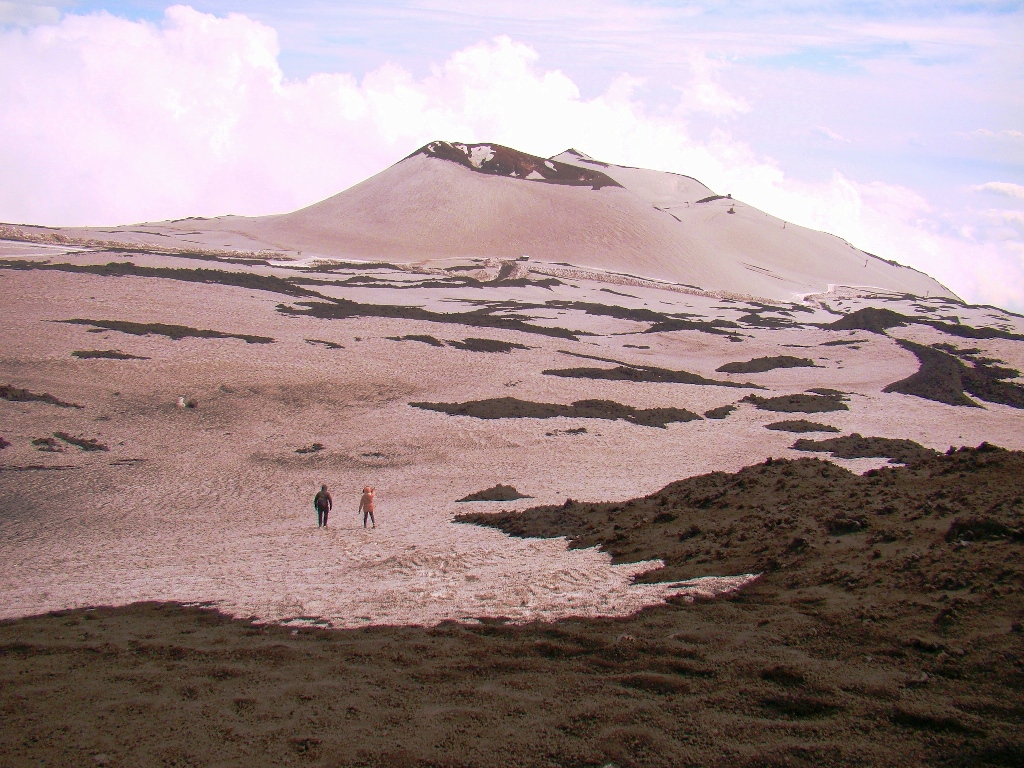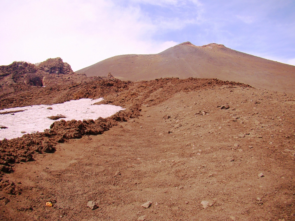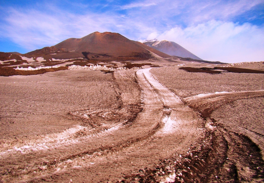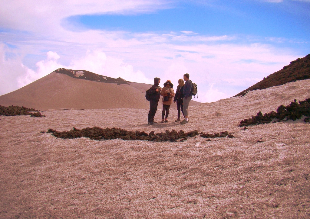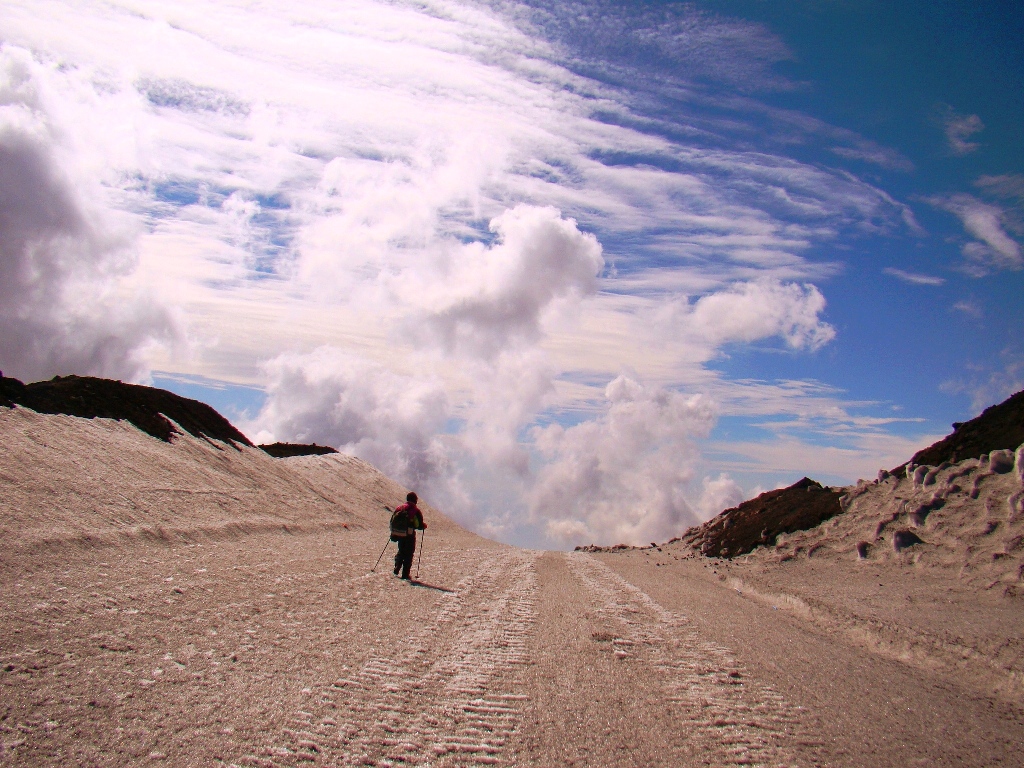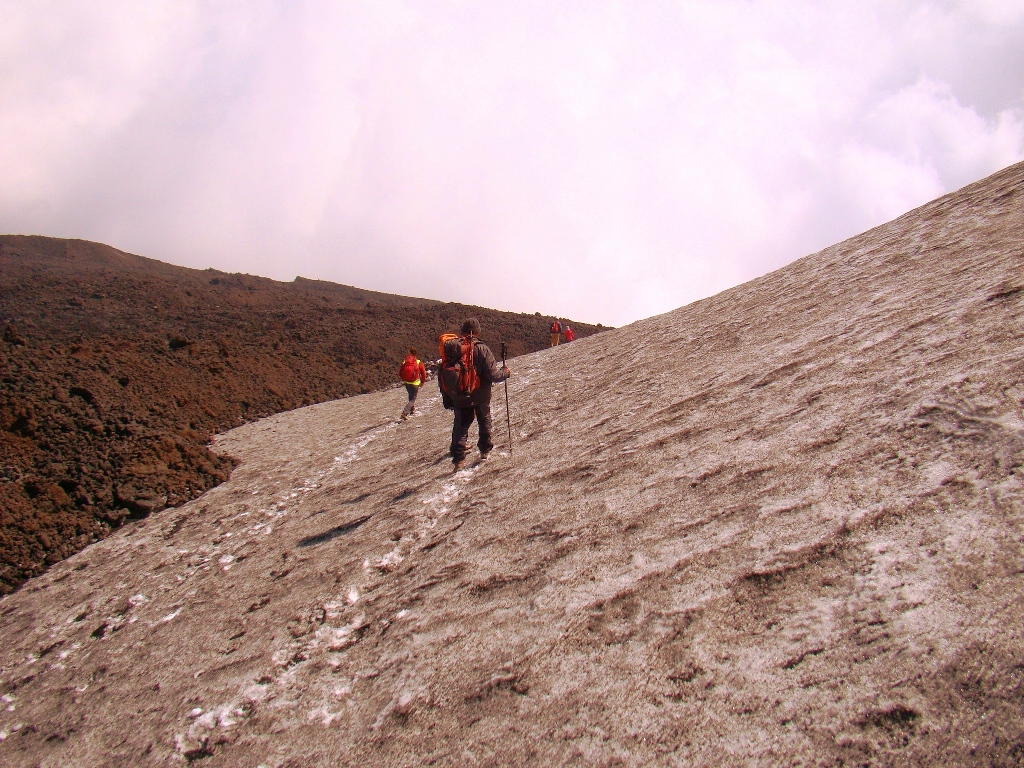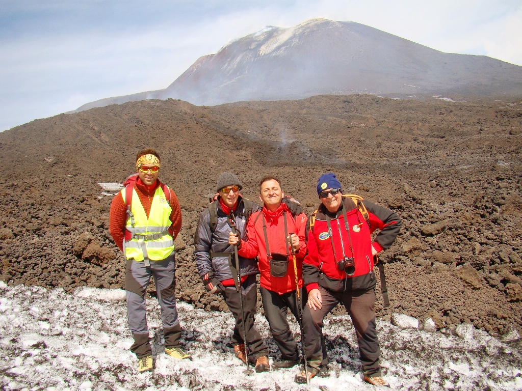 Dar să revenim. Nici nu apucăm bine să începem urcarea că ne și întâlnim cu salvamontul de pe Etna. Când mă vede cum sunt echipat, îmi recomandă să mă întorc. Facem totuși o poză împreună, apoi ei urcă într-o mașină de teren și dispar. Eu profit de moment și pornesc mai departe alături de Paulina și Darius.
