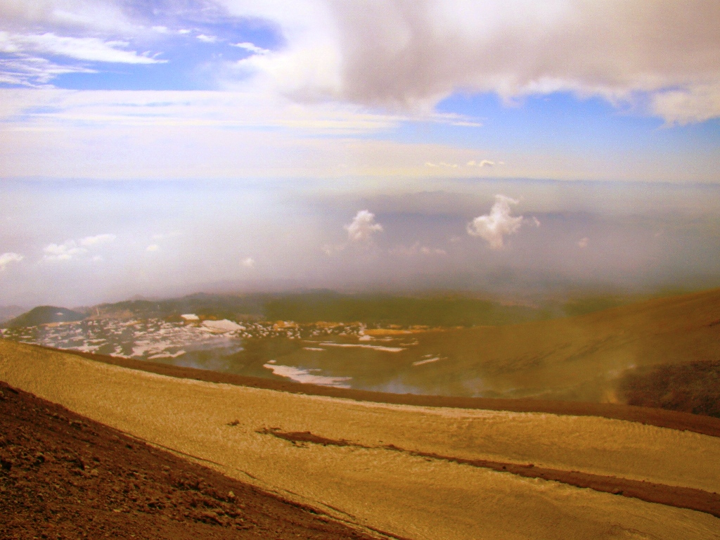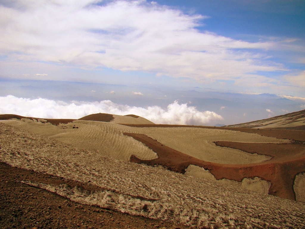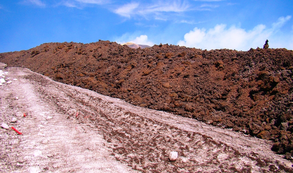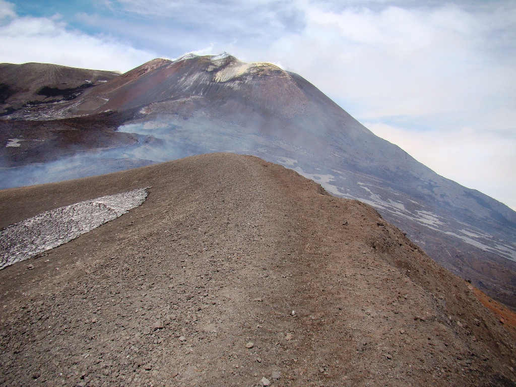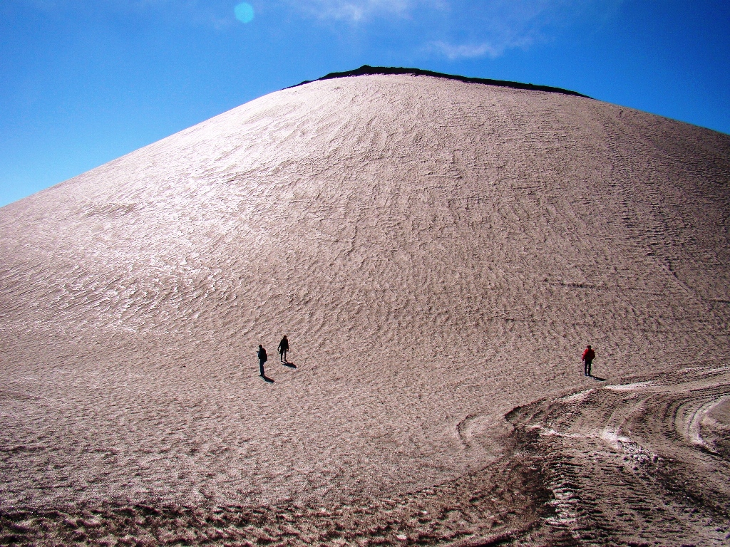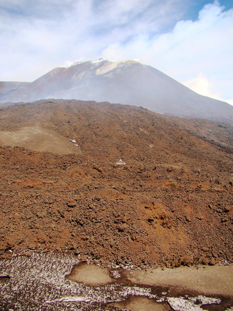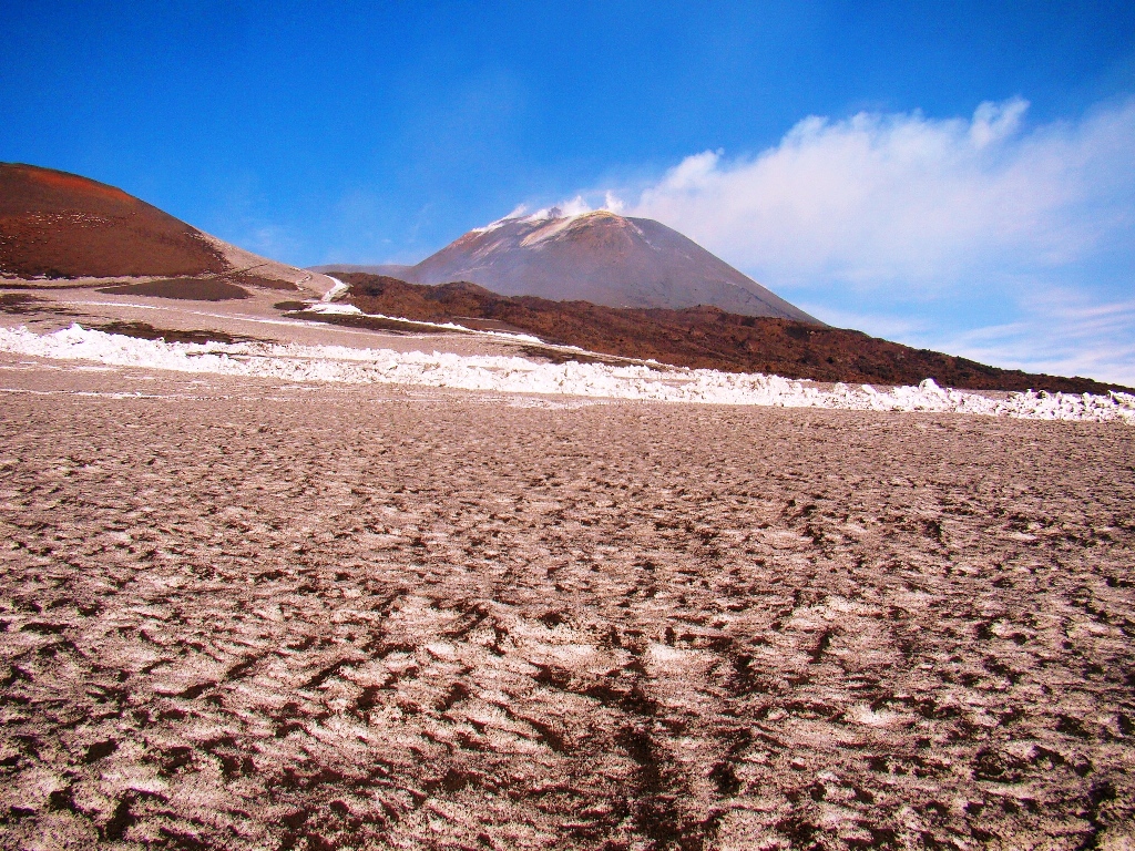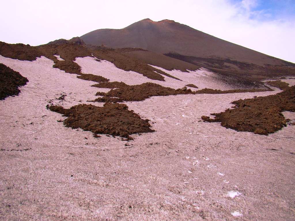 Dar să revenim. Nici nu apucăm bine să începem urcarea că ne și întâlnim cu salvamontul de pe Etna. Când mă vede cum sunt echipat, îmi recomandă să mă întorc. Facem totuși o poză împreună, apoi ei urcă într-o mașină de teren și dispar. Eu profit de moment și pornesc mai departe alături de Paulina și Darius.