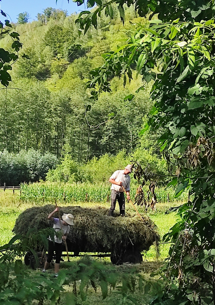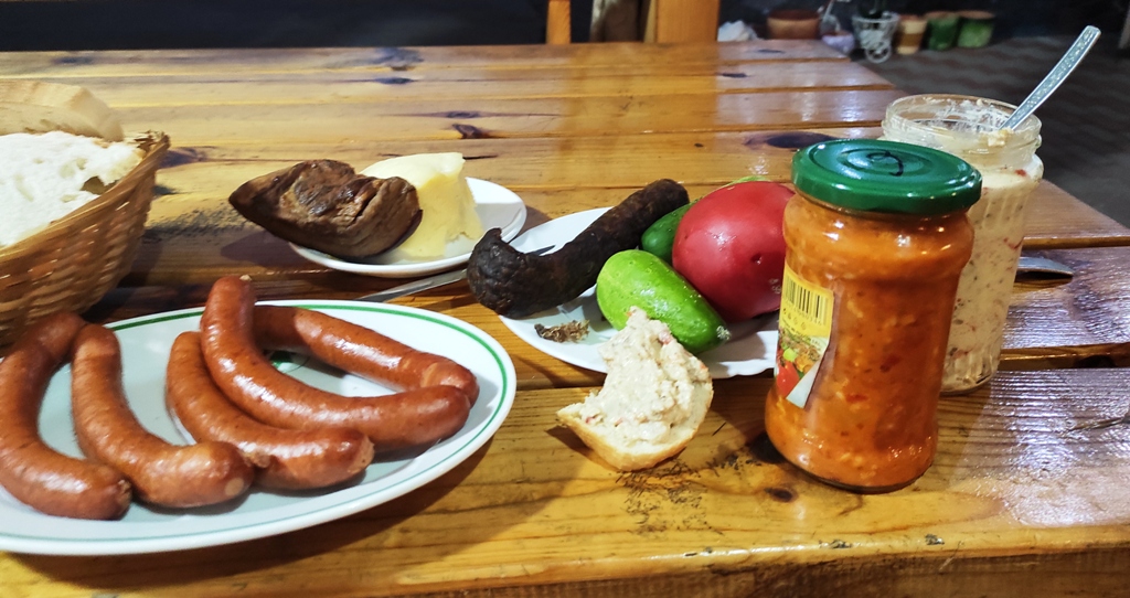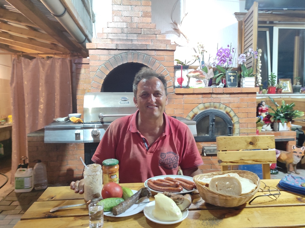 Apoi merg la magazin cumpăr în disperare o tocană de legume și aș vrea și niște vârșli dar doar dacă am unde sa îi fierb, rezolv cu băiatul care lucrează aici, mă lasă la bucătărie găsesc și niște condimente, iese ceva bun, apoi primesc și o bucățică de slăninuță de îți lasă gura apă, și două roșii și un castravete că dă bine, băiatul îmi mai găsește și o bucată de brânză de vacă foarte gustoasă, apoi doamna blondă îmi aduce și un borcan de salată de vinete de nu te mai poți opri sub nici o formă din mâncat, se mai găseşte pe undeva și un cârnat afumat de casă, şi astfel mă pomenesc dintr-o dată cu masa plină de bunătăți, de nu mai știu de unde să mai încep și unde să mai termin. Bineînțeles că după ce mă satur, ce rămâne le iau la pachet și astfel am mâncare pentru încă vreo trei zile de acum încolo. Între timp apare și mama lui David, nora lui nea Horia și stăm de vorbă la un pahar de pălincă și le spun totul despre traseul meu.