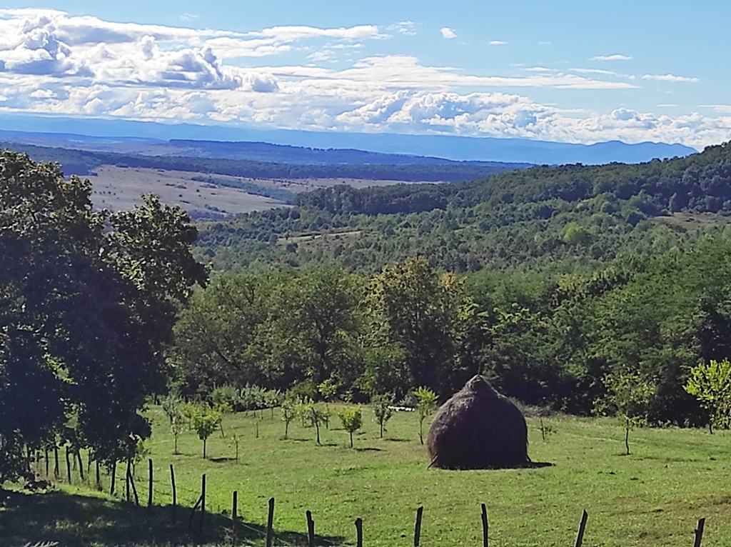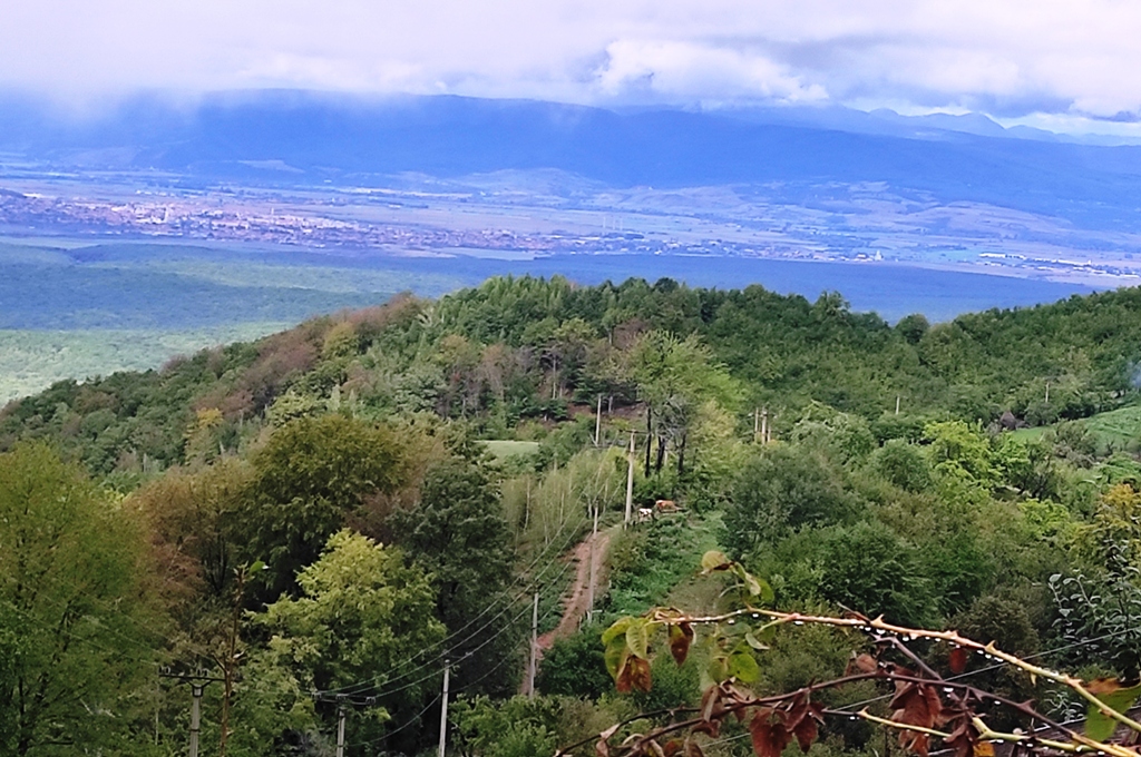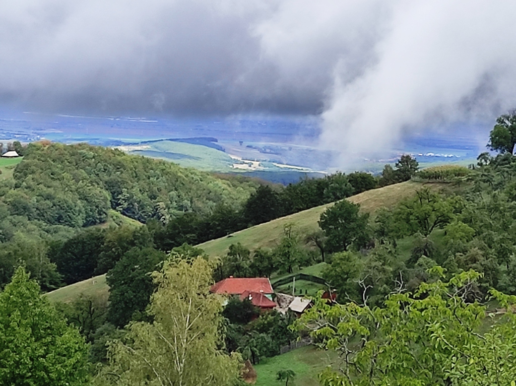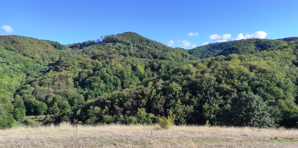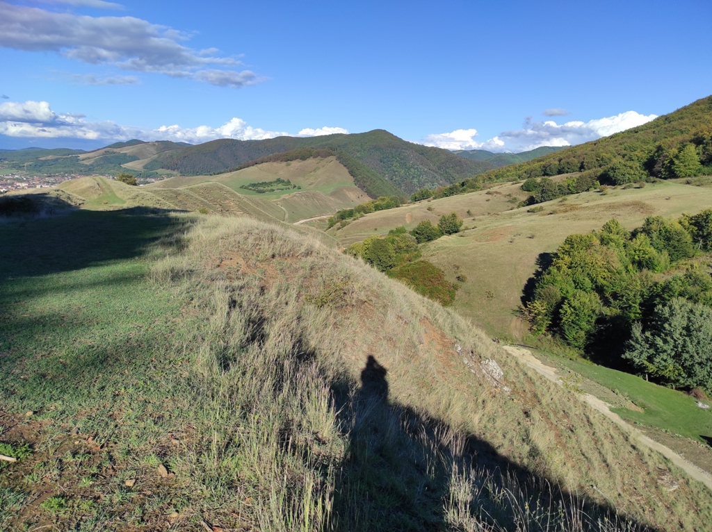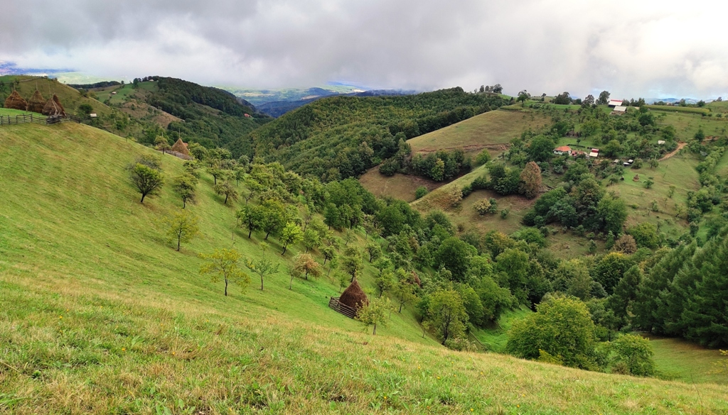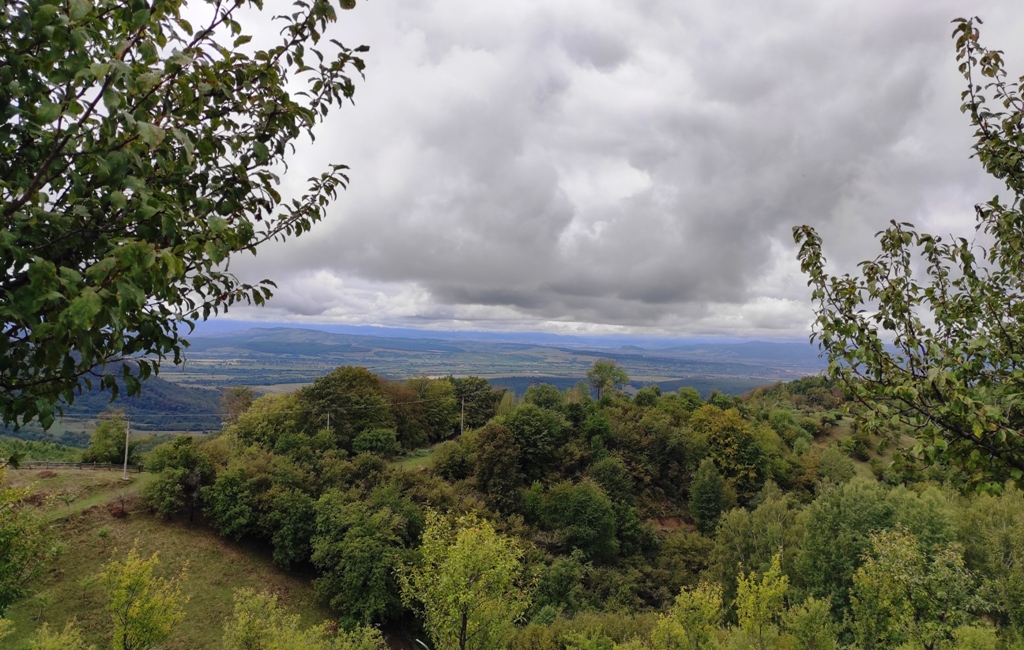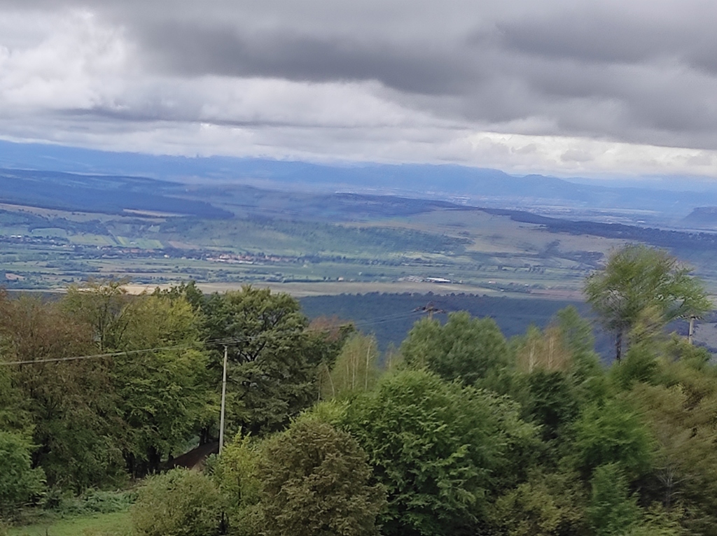 Trec prin Romoșel, urc apoi în vârful dealului și văd undeva în zare Parângul și recunosc și releul de la Rânca iar drept înainte nu departe e valea Mureșului, după aceea munții Poiana Ruscă, Metaliferii, munții Trăscăului, și mulți alții până undeva departe în inima Apusenilor.