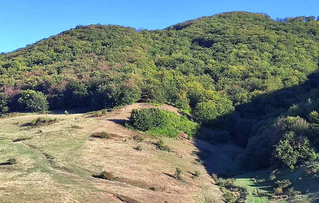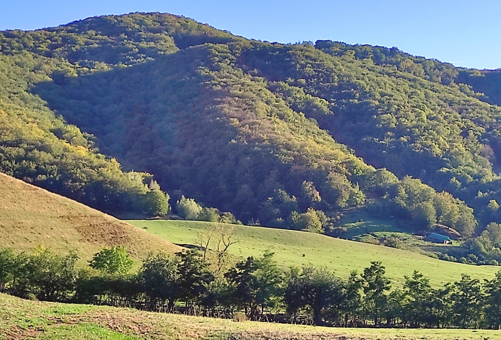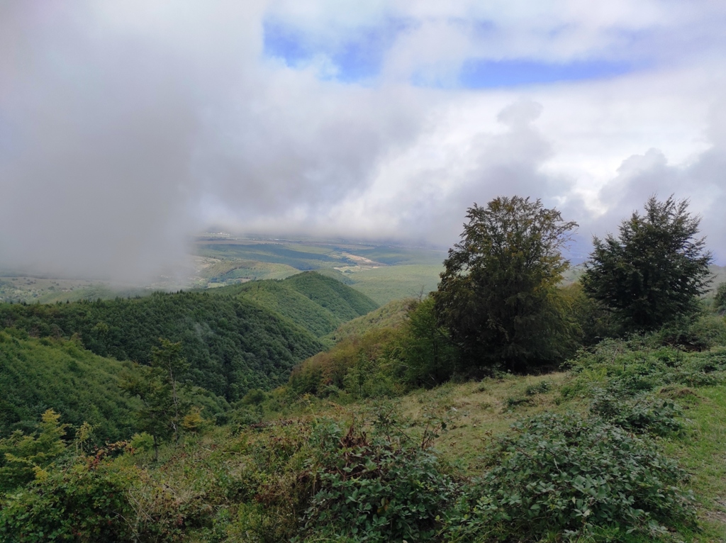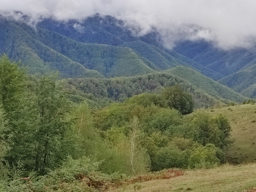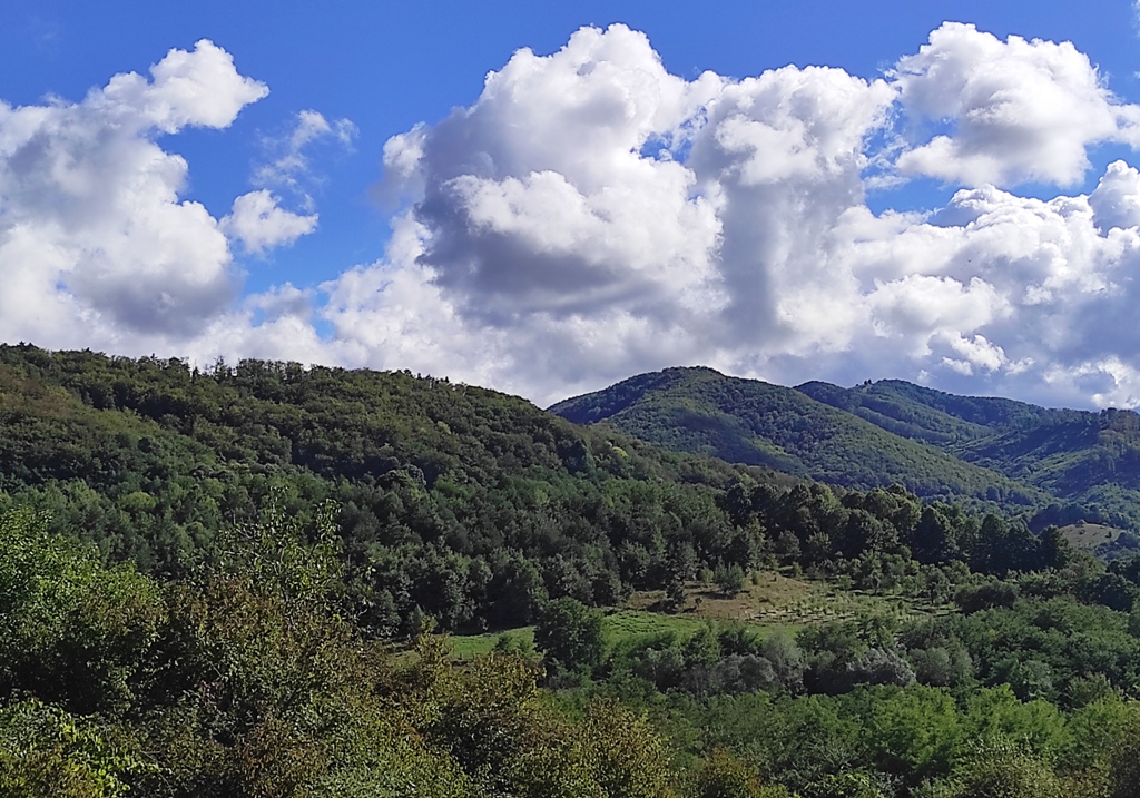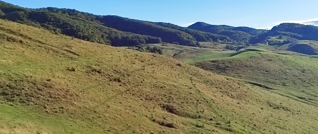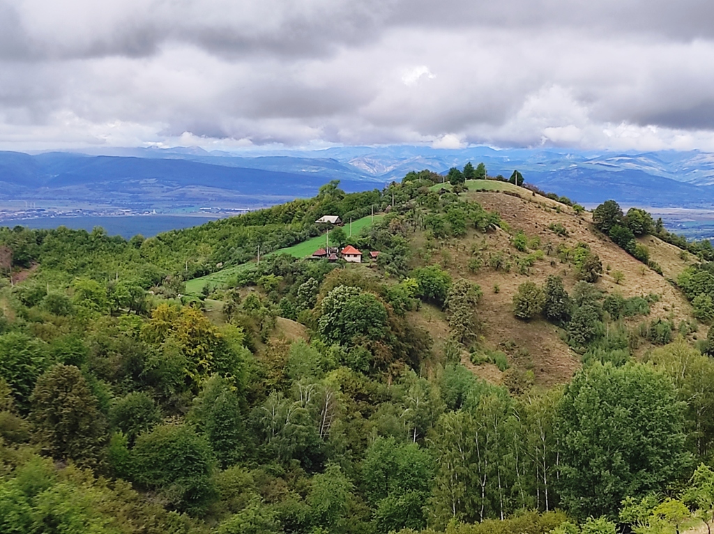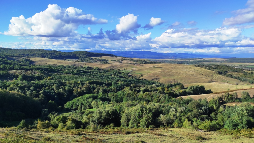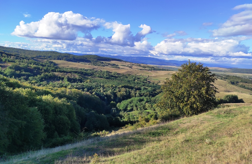 Trec prin Romoșel, urc apoi în vârful dealului și văd undeva în zare Parângul și recunosc și releul de la Rânca iar drept înainte nu departe e valea Mureșului, după aceea munții Poiana Ruscă, Metaliferii, munții Trăscăului, și mulți alții până undeva departe în inima Apusenilor.