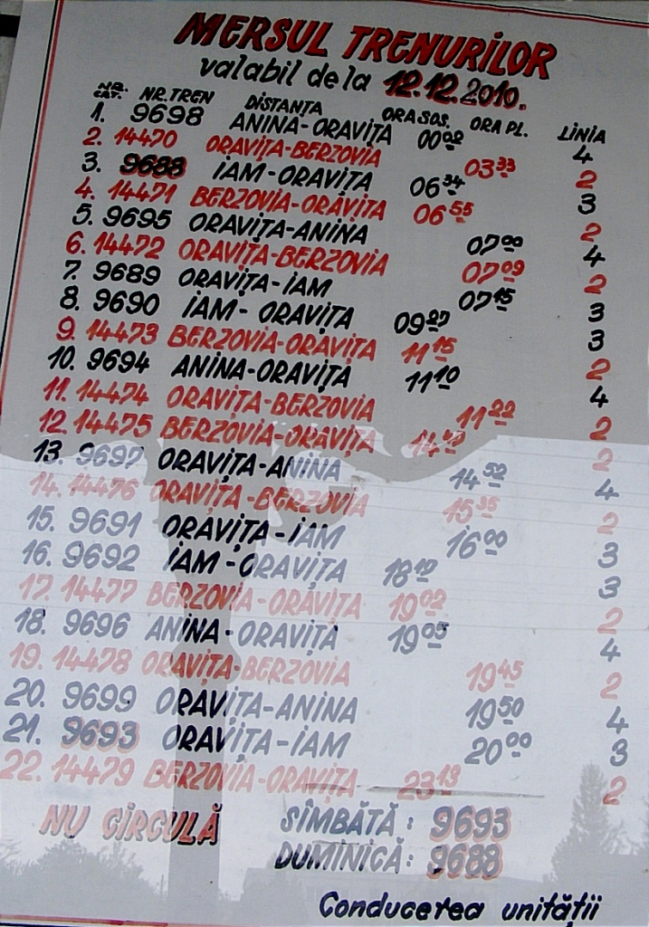 În 2011, când am mers pentru prima oară cu trenul pe această rută, am descoperit un mers de tren afișat pe peronul gării din Oravița, unde pe vremea aceea garniturile se succedau în ritm frecvent, asigurând conexiuni către multiple destinații. Acum, nu a mai rămas decât o singură rută, spre Anina pe care cu mari eforturi mai circulă doar un singur tren dus-întors, o relicvă salvată ca prin minune de la desființarea definitivă. Cu toate acestea, viitorul ei pare sumbru, iar întrebarea rămâne: Va fi oare salvată această bijuterie feroviară?